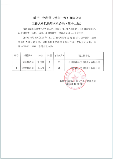 淼控生物环保(佛山三水)有限公司工作人员拟录用名单公示(第十二批)