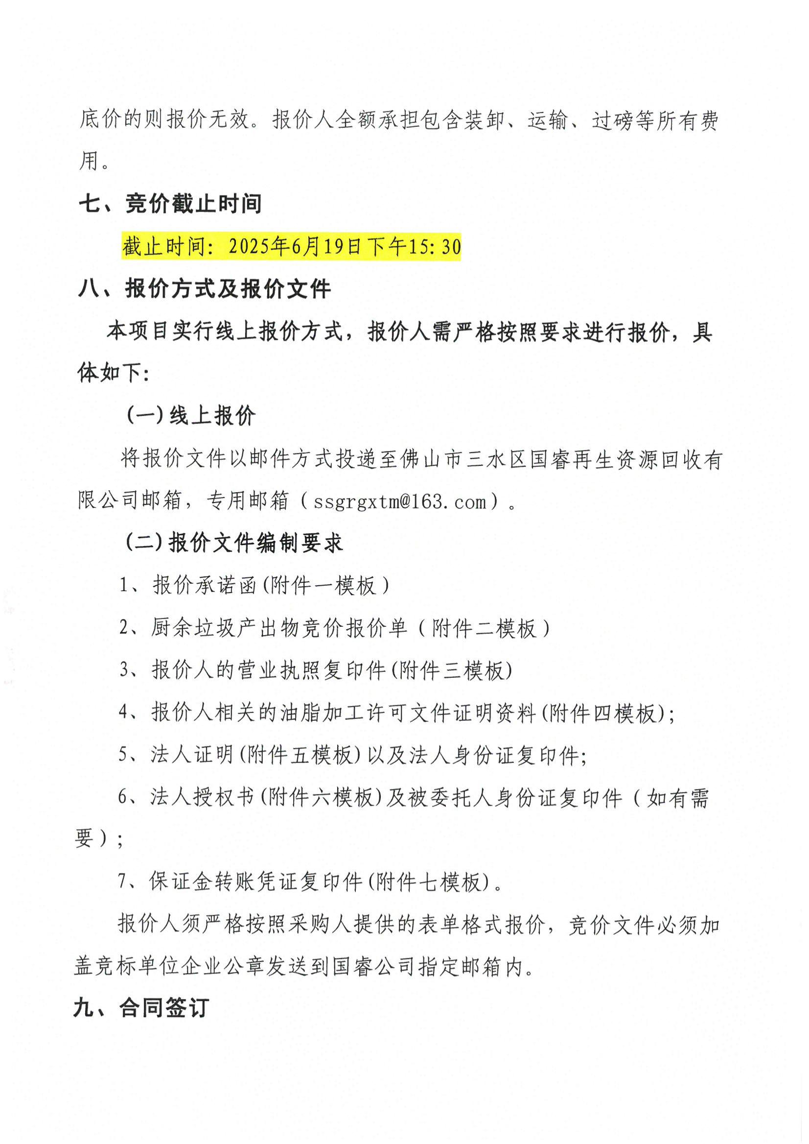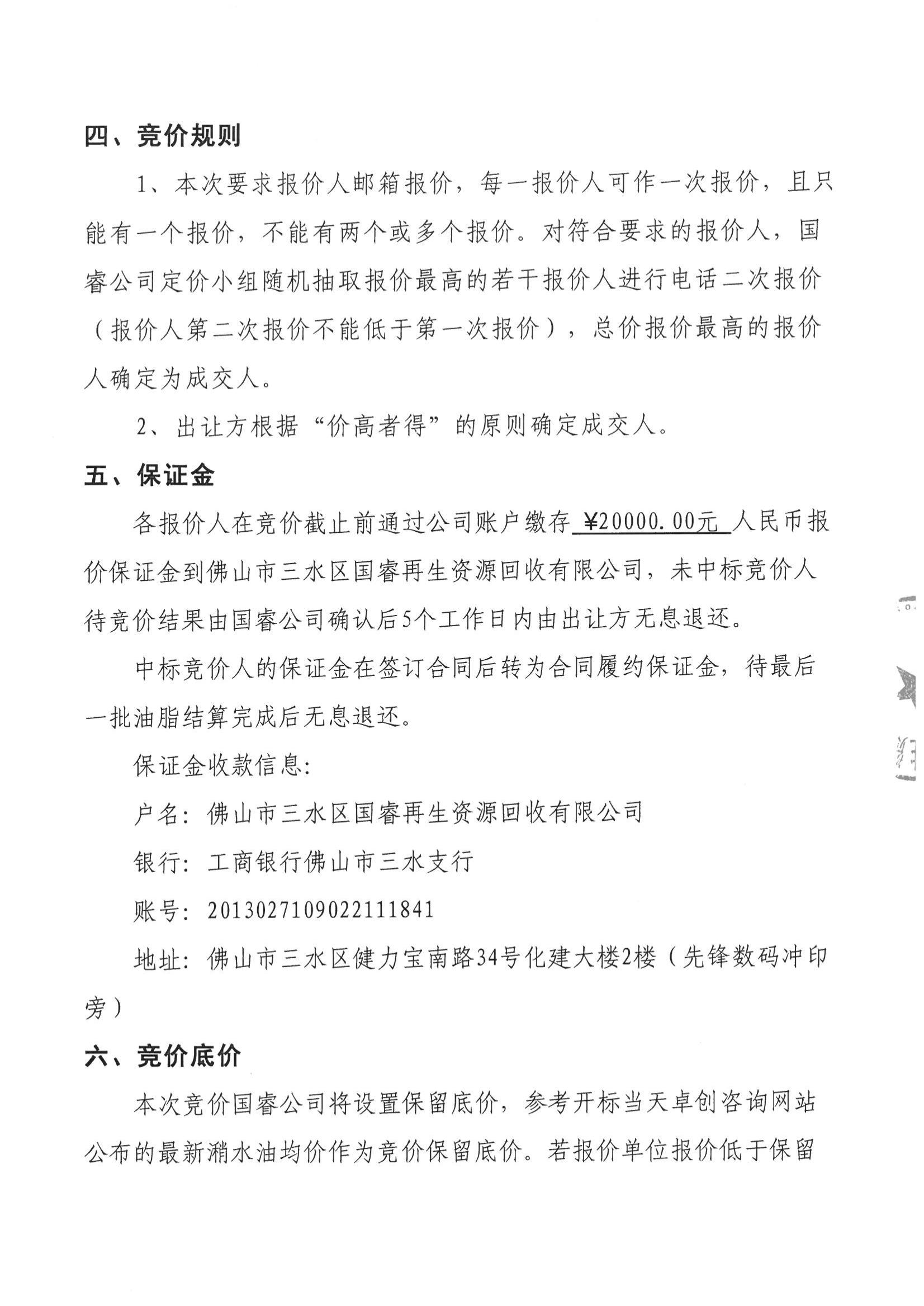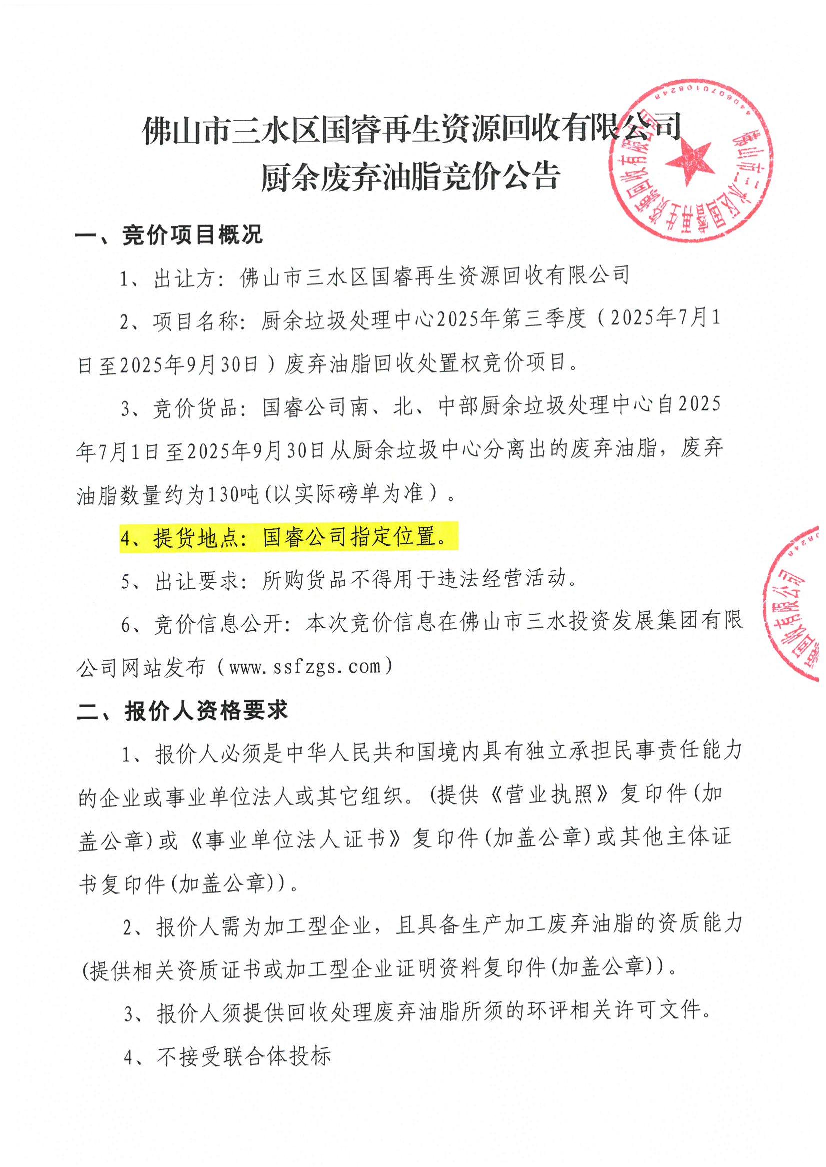佛山市三水区国睿再生资源回收公司厨余废弃油脂竞价公告
