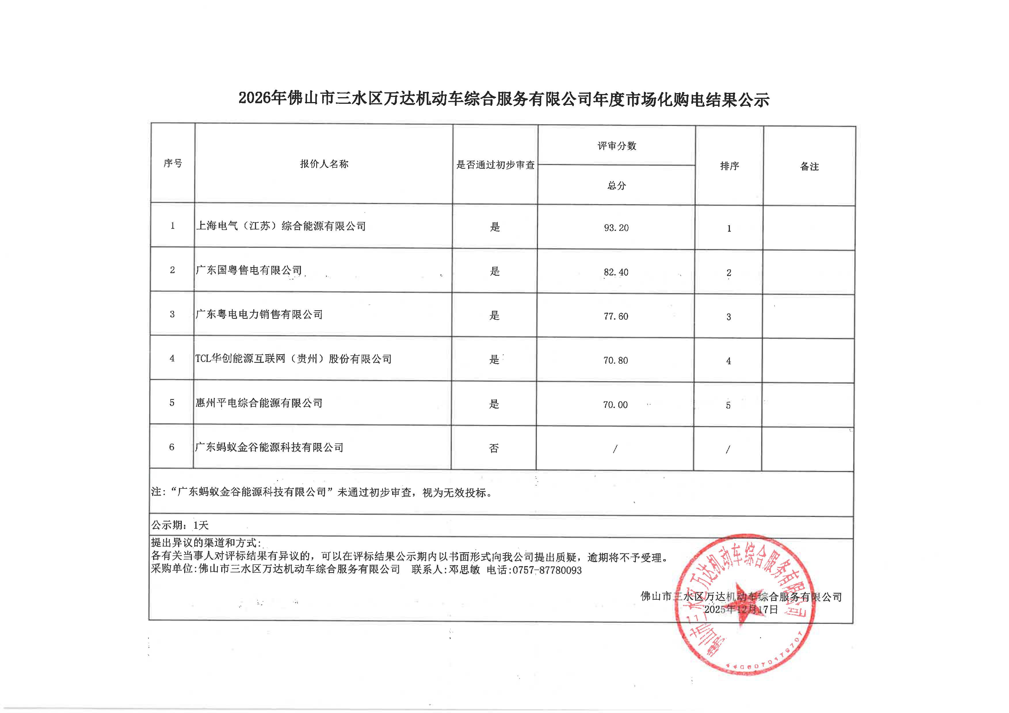 2026年佛山市三水区万达机动车综合服务有限公司年度市场化购电结果公示
