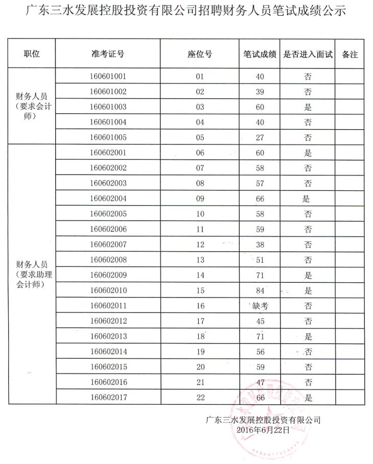 广东williamhill中文官网控股投资有限公司招聘财务人员笔试成绩公示