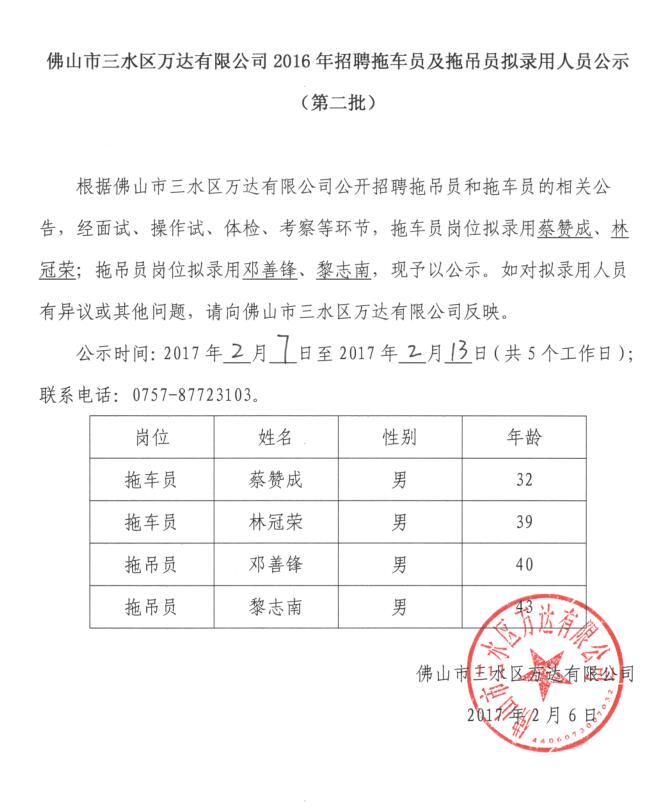 佛山市三水区万达有限公司2016年招聘拖车员及拖吊员拟录用人员公示(第二批)