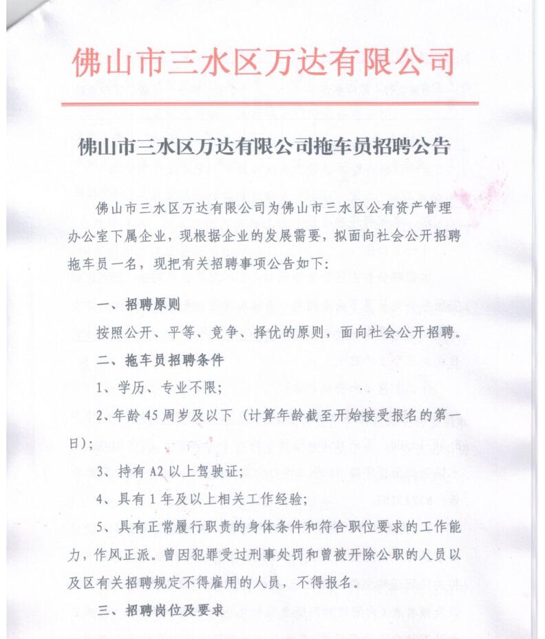 佛山市三水区万达有限公司拖车员招聘公告