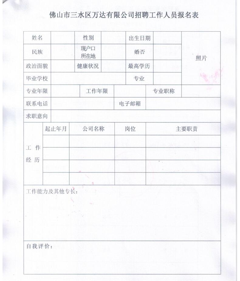 佛山市三水区万达有限公司招聘工作人员报名表