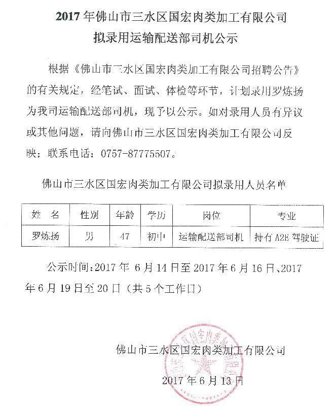 2017年佛山市三水区国宏肉类加工有限公司拟录用运输配送部司机公示