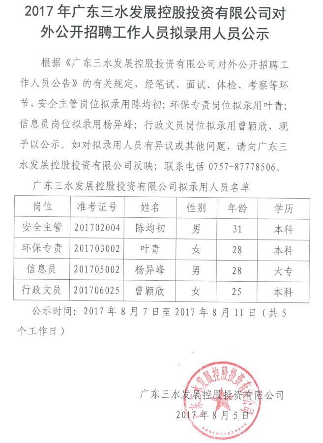 2017年广东williamhill中文官网控股投资有限公司对外公开招聘工作人员拟录用人员公示