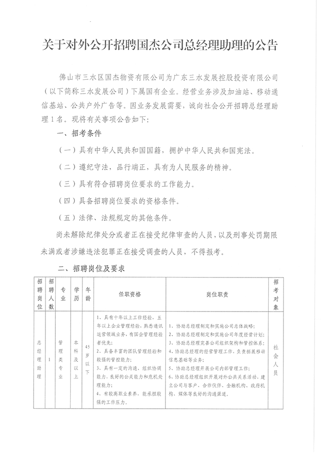 关于对外公开招聘国杰公司总经理助理的公告