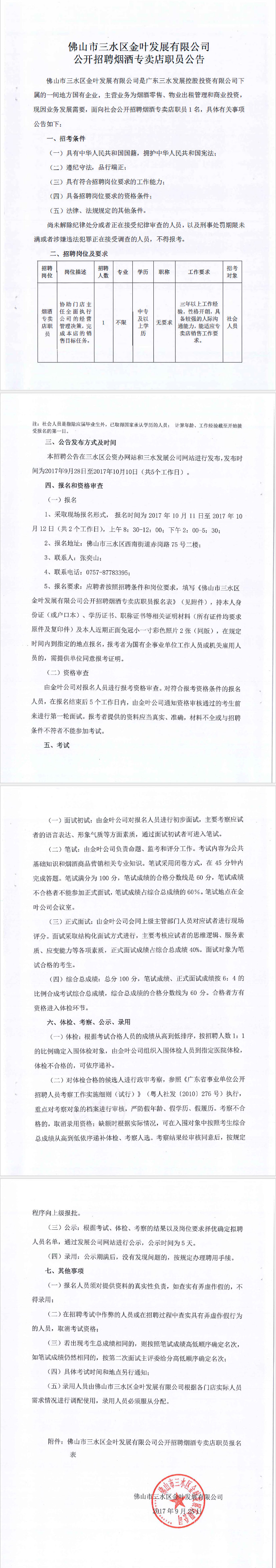 佛山市三水区金叶发展有限公司公开招聘烟酒专卖店职员公告