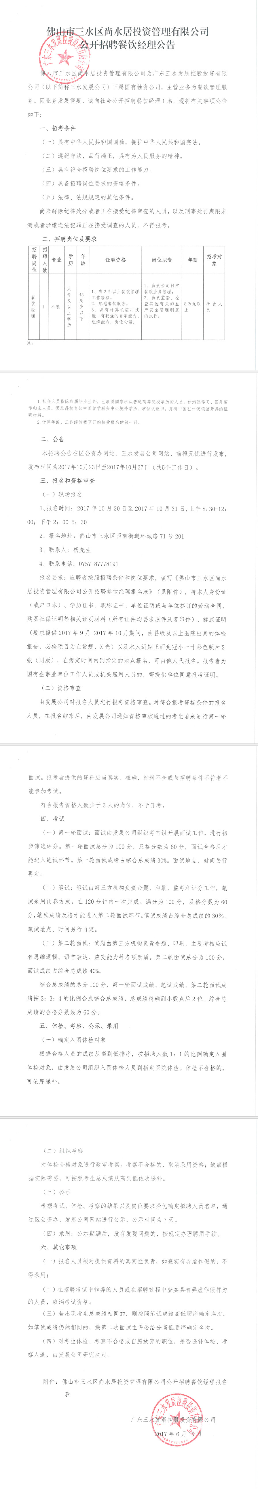 佛山市三水区尚水居投资管理有限公司公开招聘餐饮经理公告