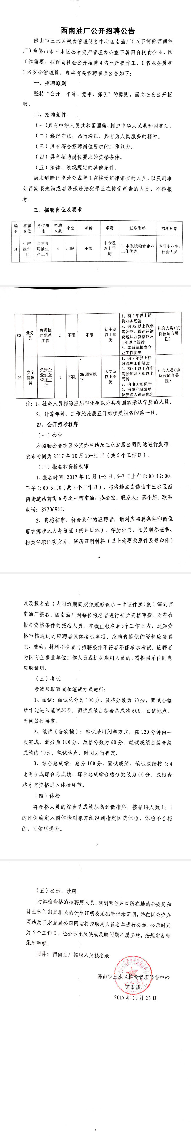 佛山市三水区粮食管理储备中心西南油厂公开招聘公告