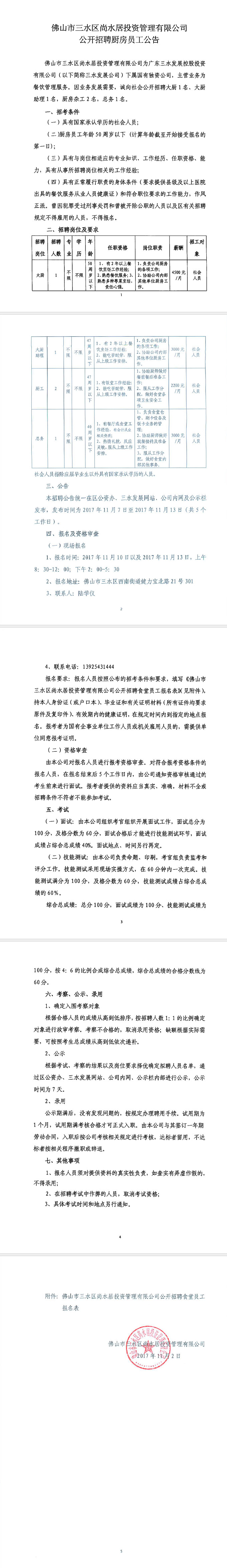 佛山市三水区尚水居投资管理有限公司公开招聘厨房员工公告