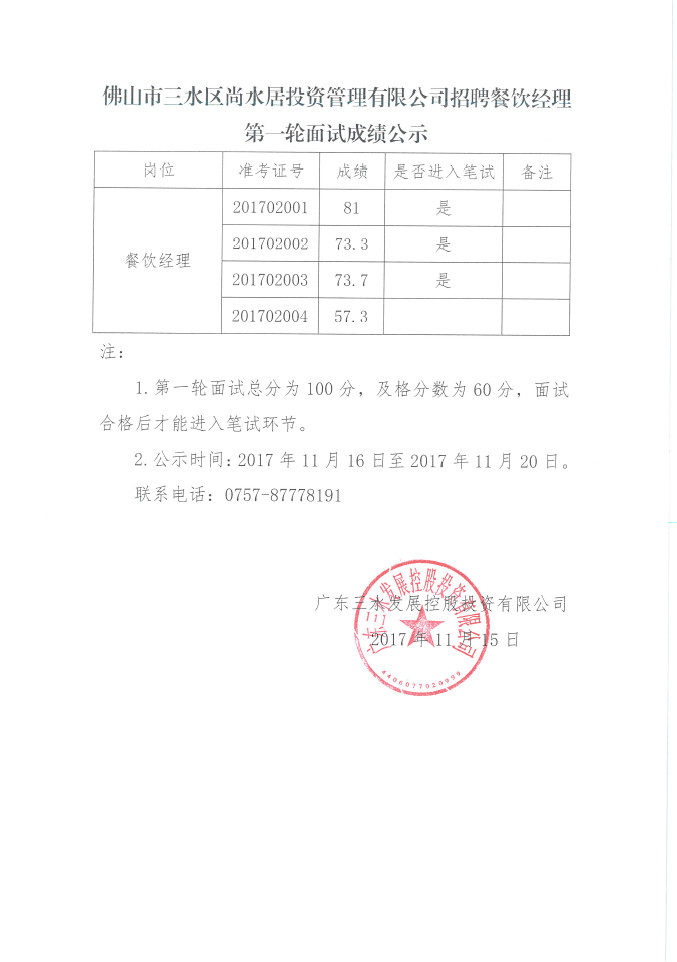 佛山市三水区尚水居投资管理有限公司公开招聘餐饮经理第一轮面试成绩公示