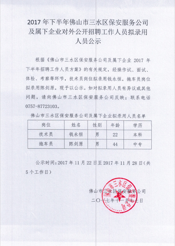 2017年下半年佛山市三水区保安服务公司及属下企业对外公开招聘工作人员拟录用人员公示