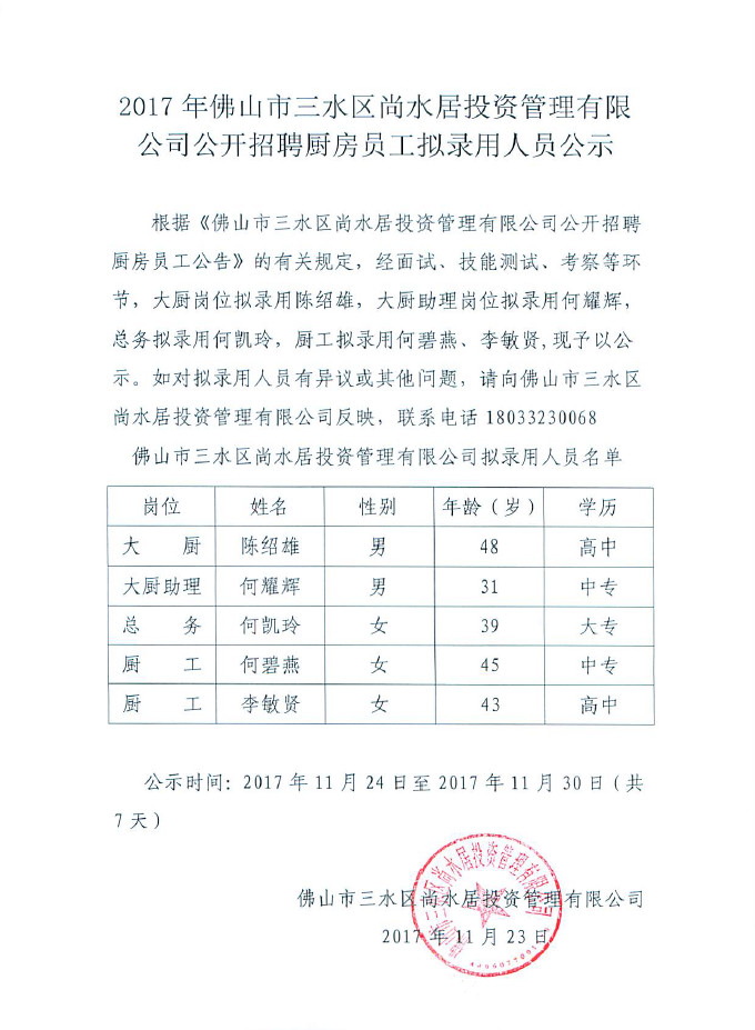 2017年佛山市三水区尚水居投资管理有限公司公开招聘厨房员工拟录用人员公示
