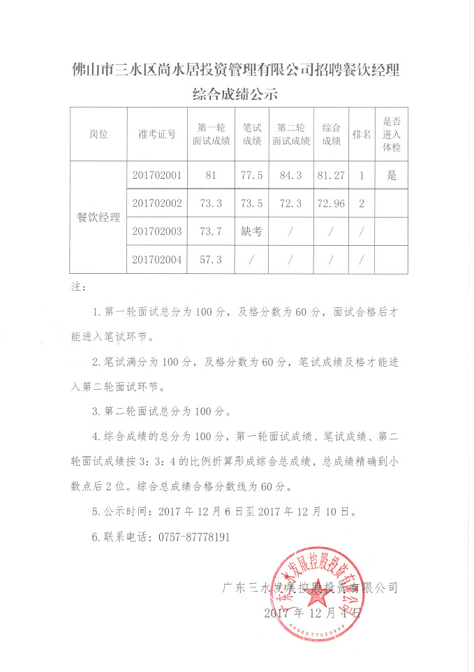 佛山市三水区尚水居投资管理有限公司公开招聘餐饮经理综合成绩公示