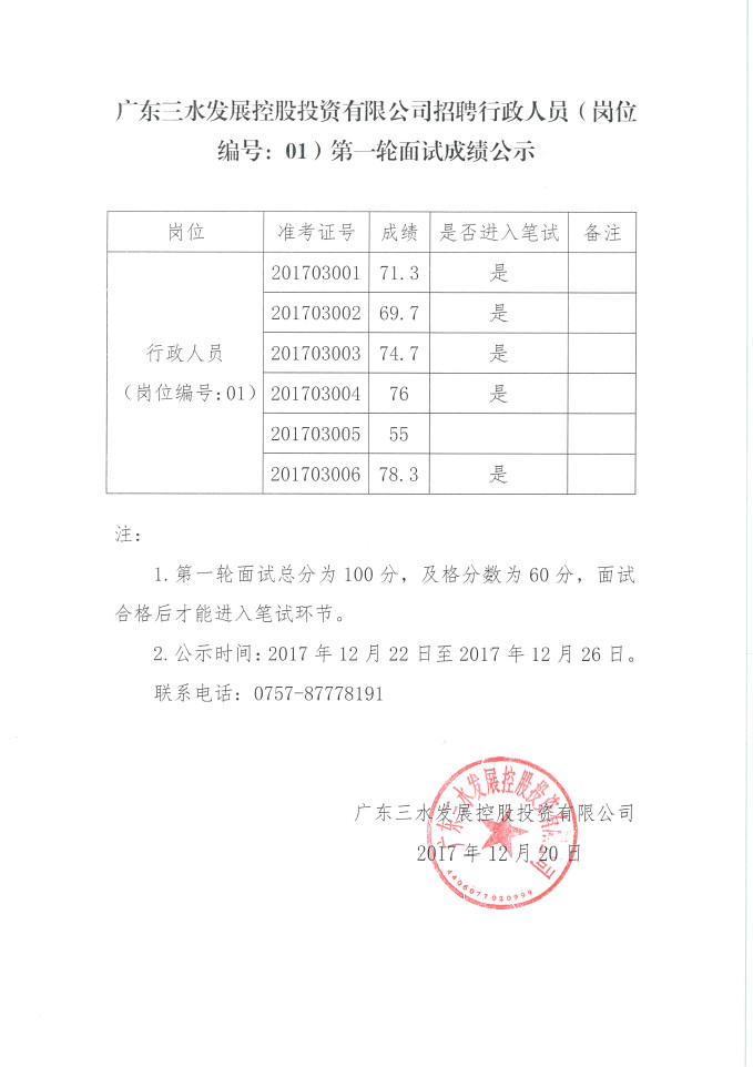 广东williamhill中文官网控股投资有限公司招聘行政人员(岗位编号:01)第一轮面试成绩公示