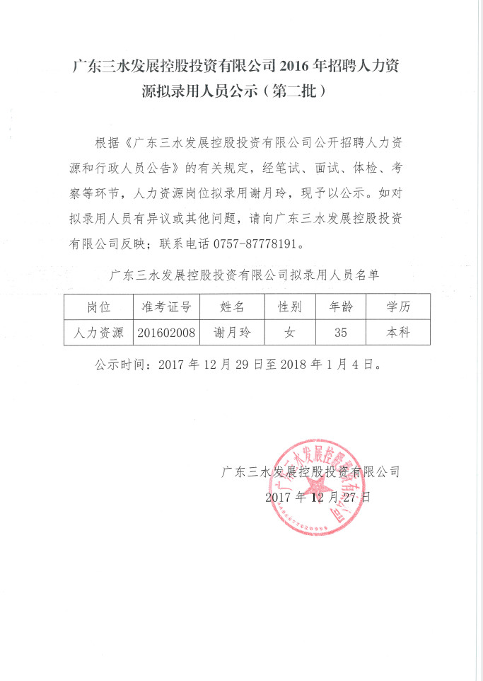 广东williamhill中文官网控股投资有限公司2016年招聘人力资源拟录用人员公示(第二批)