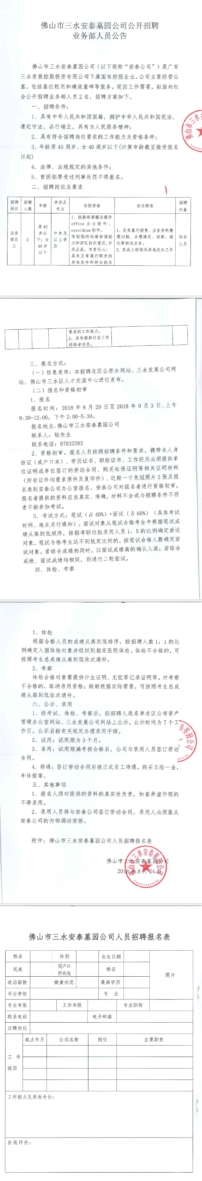 佛山市三水安泰墓园公司公开招聘业务部人员公告