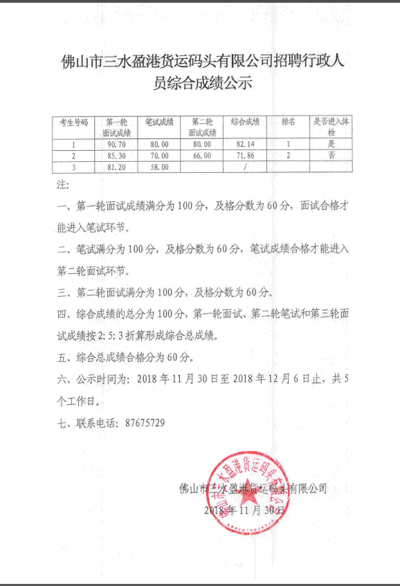 佛山市三水盈港货运码头有限公司公开招聘行政人员综合成绩公告