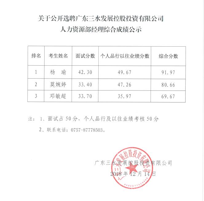 关于公开选聘广东williamhill中文官网控股投资有限公司人力资源部经理综合成绩公示
