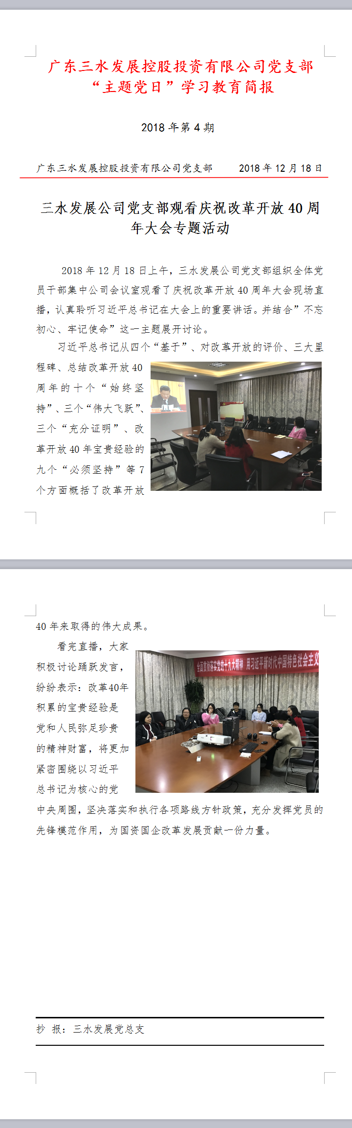 第4期主题党日工作简报20181218(观看庆祝改革40周年大会)