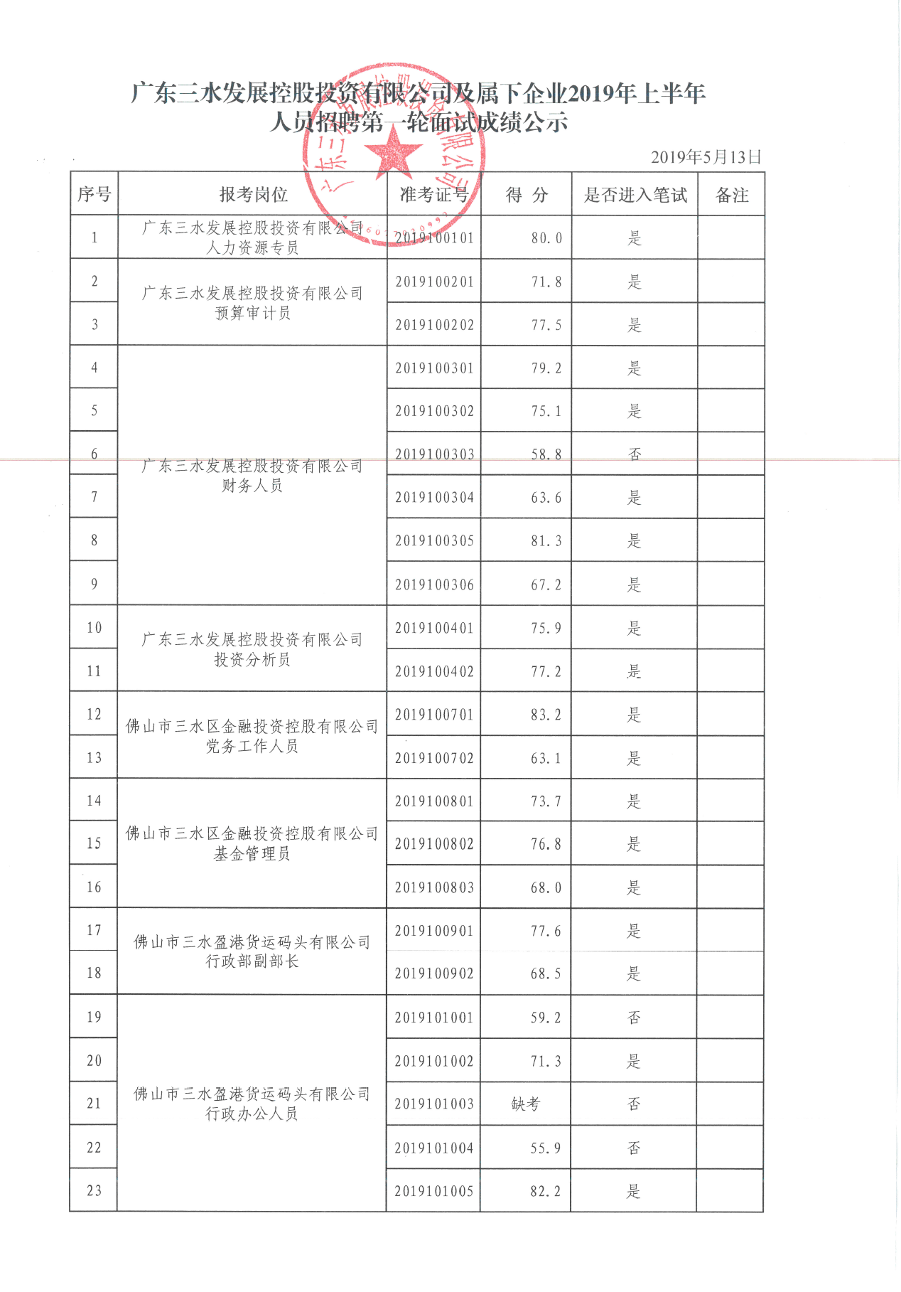 广东williamhill中文官网控股投资有限公司及属下企业2019年上半年人员招聘第一轮面试成绩公示