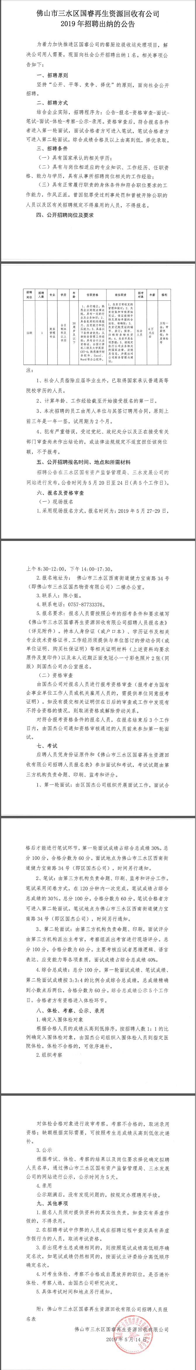 佛山市三水区国睿再生资源回收有公司2019年招聘出纳的公告
