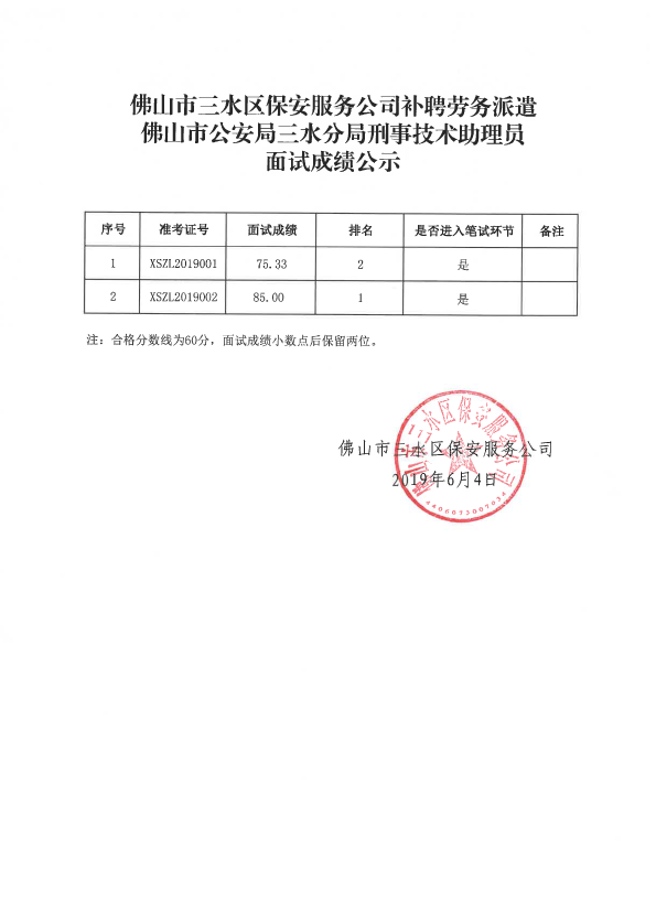 佛山市三水区保安服务公司补聘劳务派遣佛山市公安局三水分局刑事技术助理员面试成绩公示