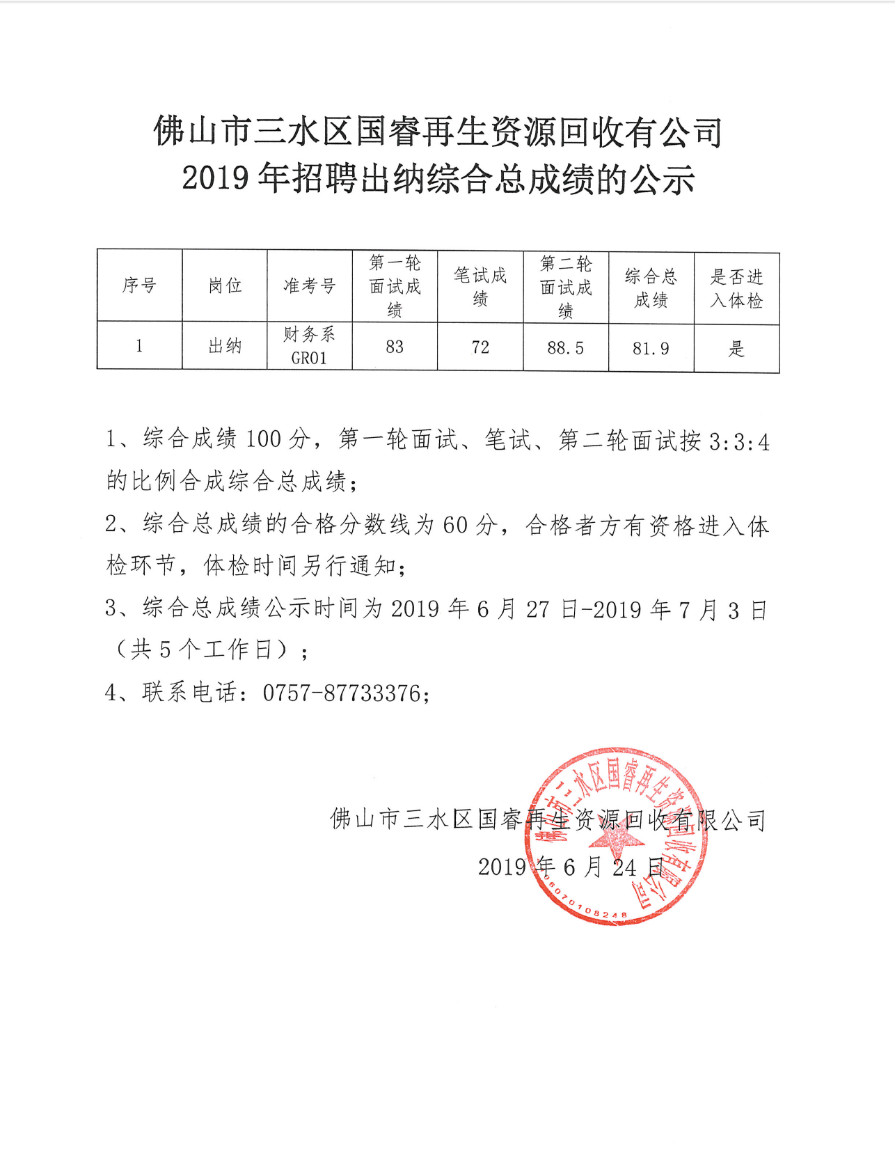佛山市三水区国睿再生资源回收有公司2019年招聘出纳综合总成绩的公示