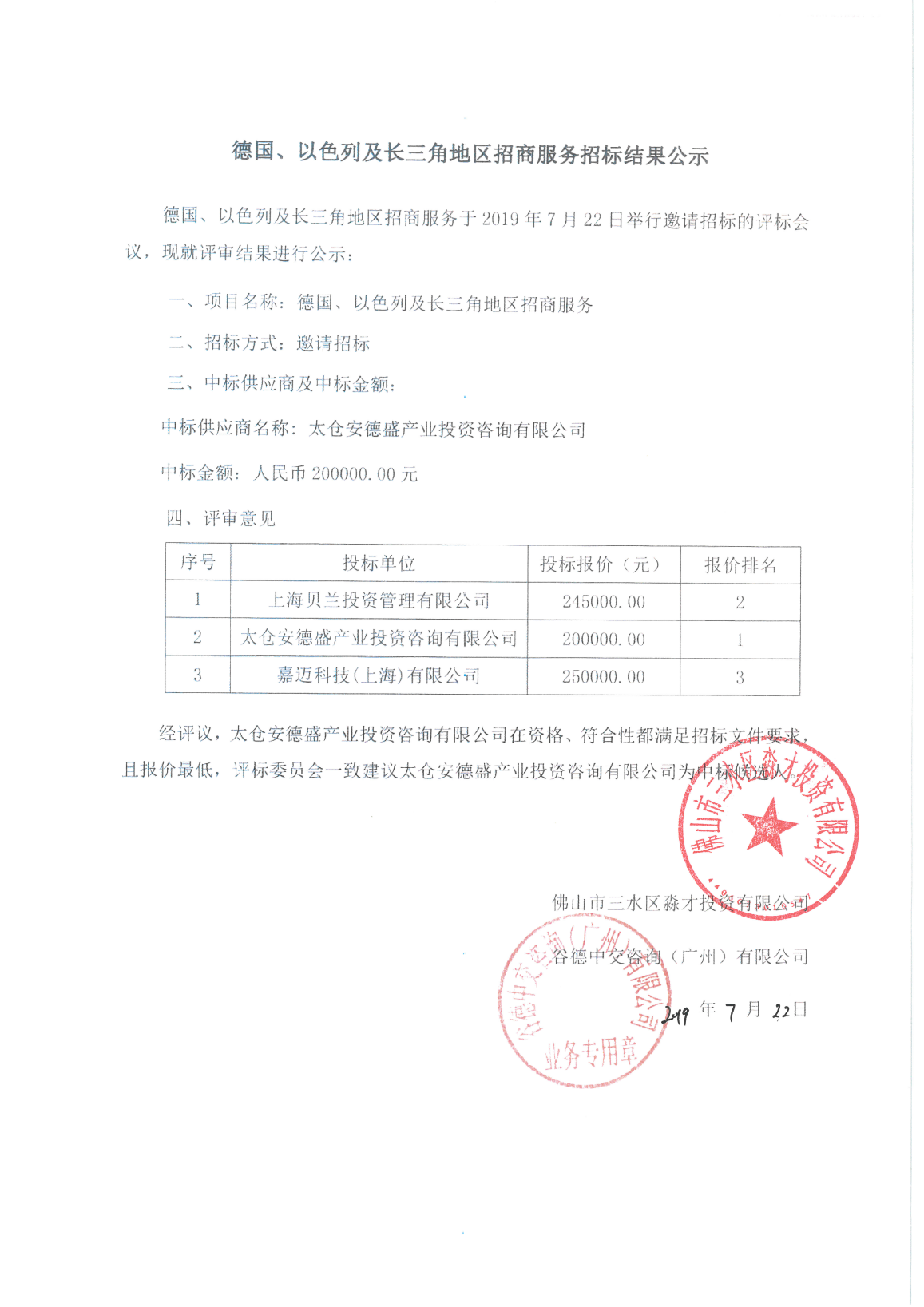 佛山三水区淼才投资有限公司德国、以色列及长三角地区招商服务招标结果公示