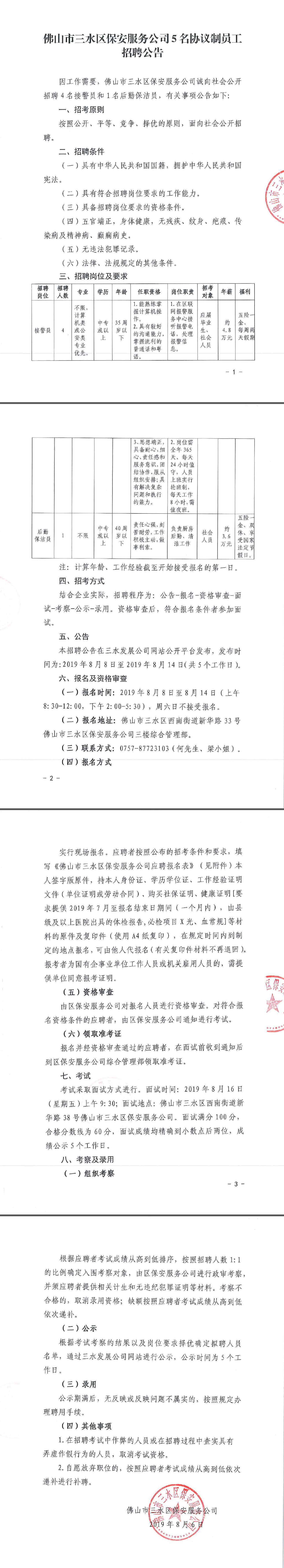 佛山市三水区保安服务公司5名协议制员工招聘公告
