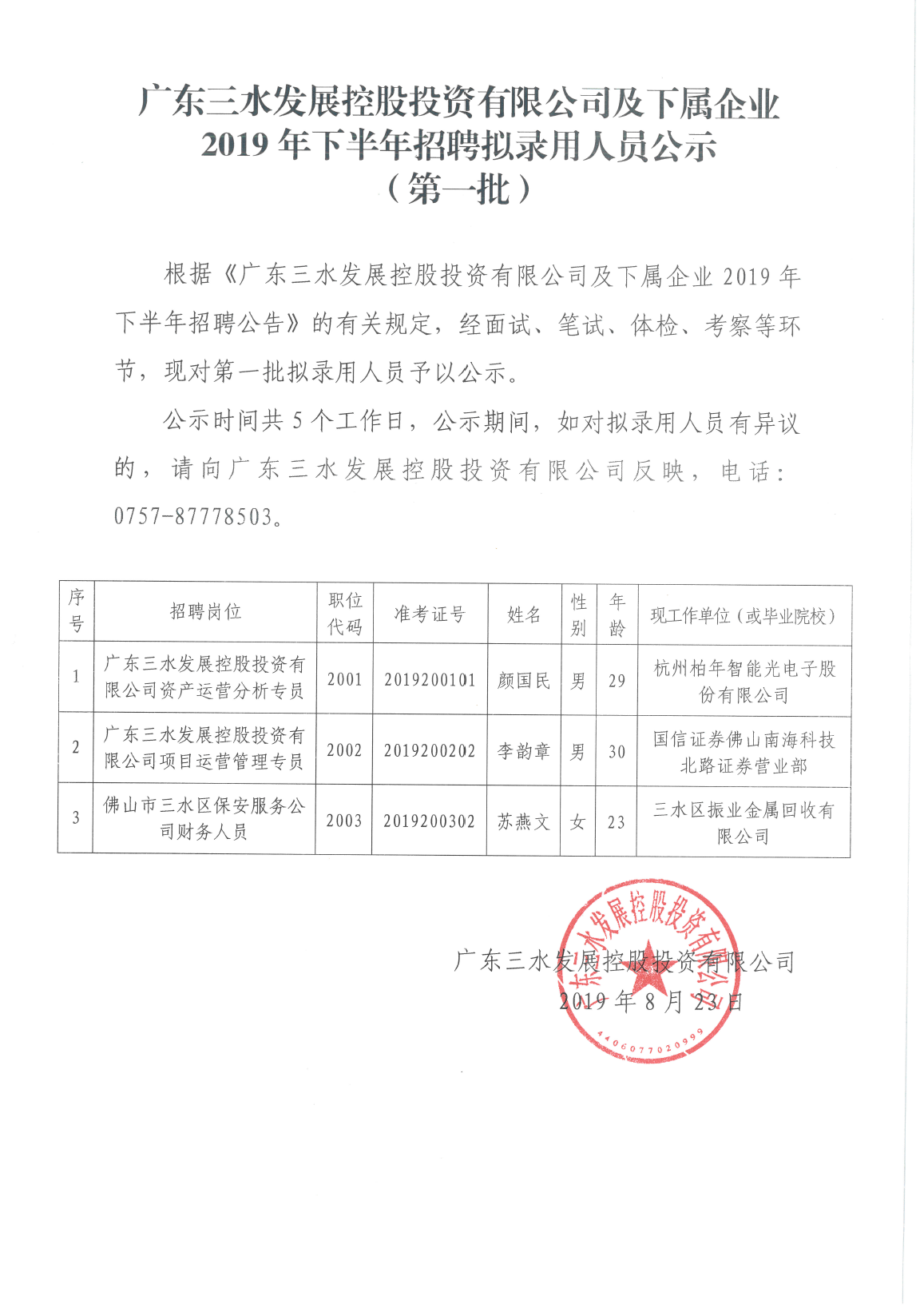 广东williamhill中文官网控股投资有限公司及下属企业2019年下半年招聘拟录用人员公示(第一批)