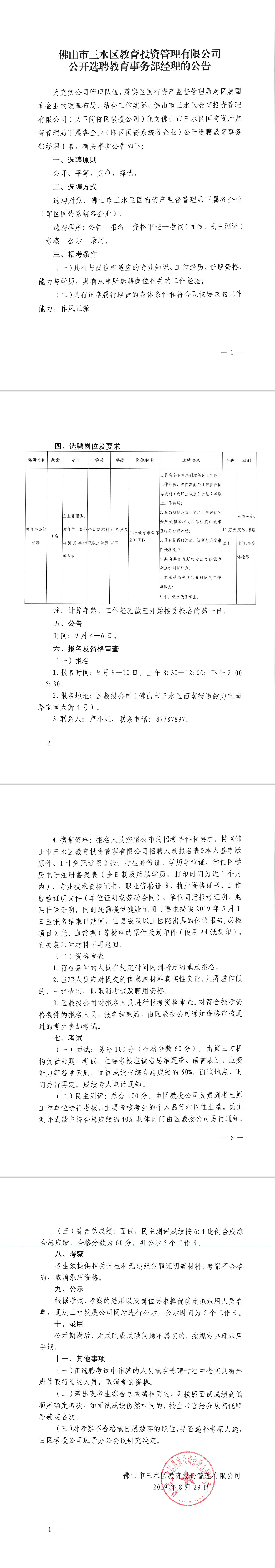 佛山市三水区教育投资管理有限公司公开选聘教育事务部经理公开选聘的公告