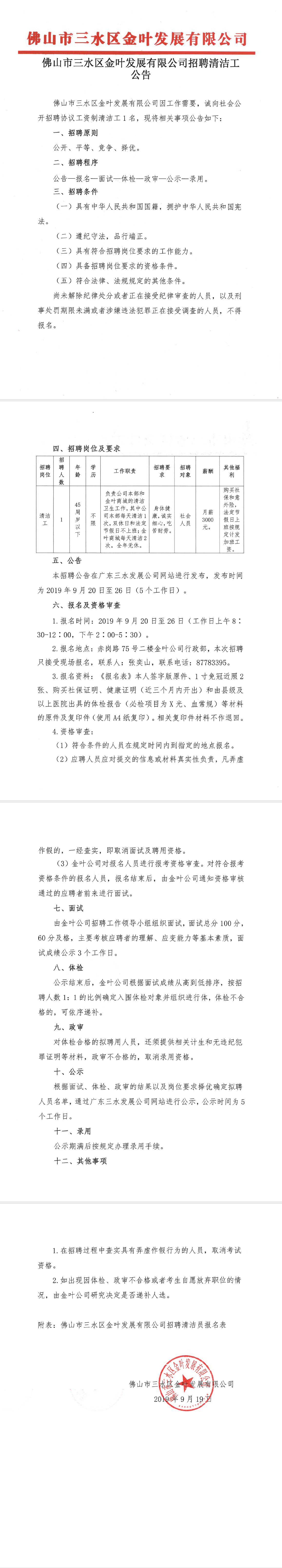 佛山市三水区金叶发展有限公司招聘清洁工公告