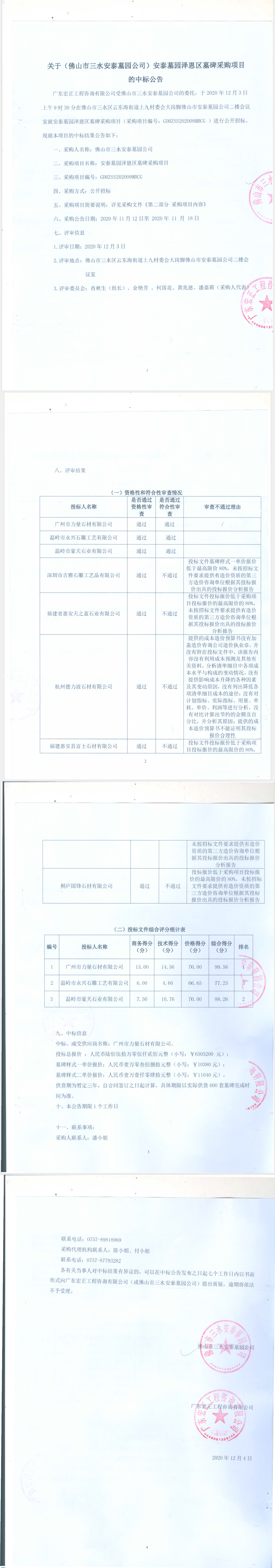 关于(佛山市三水安泰墓园公司)安泰墓园泽恩区墓碑采购项目的中标公告