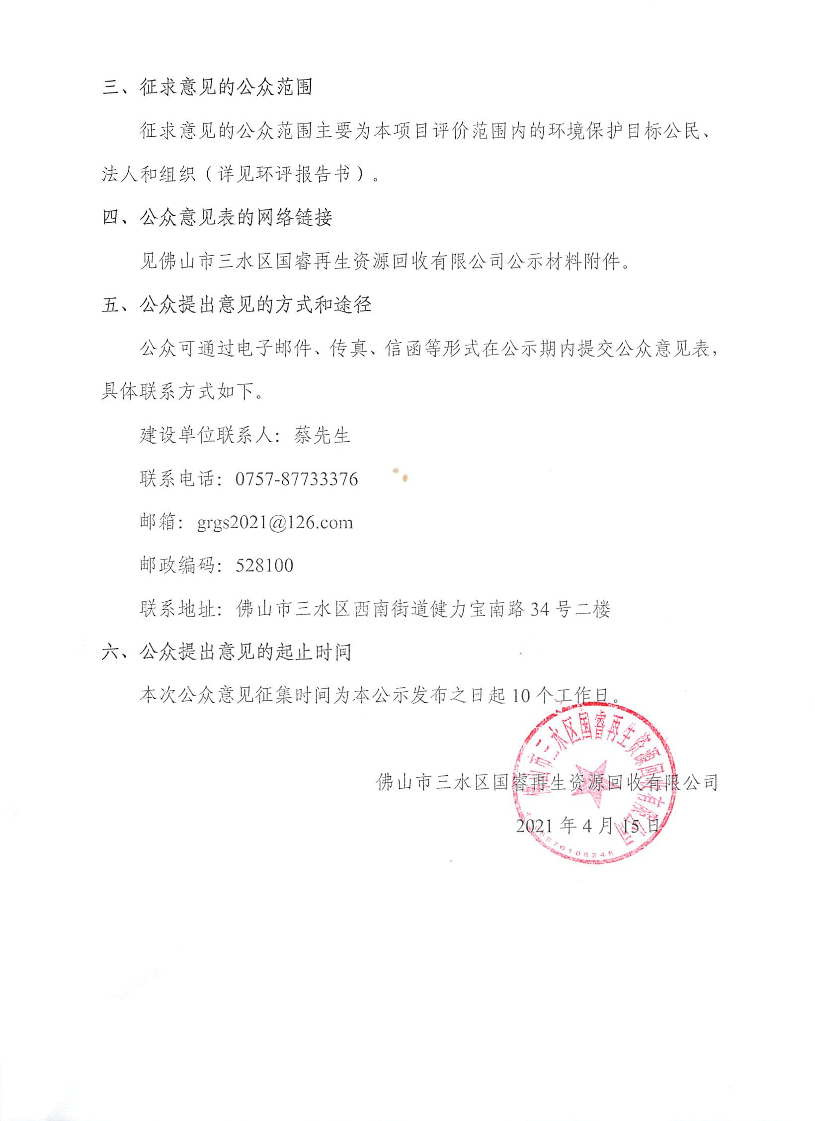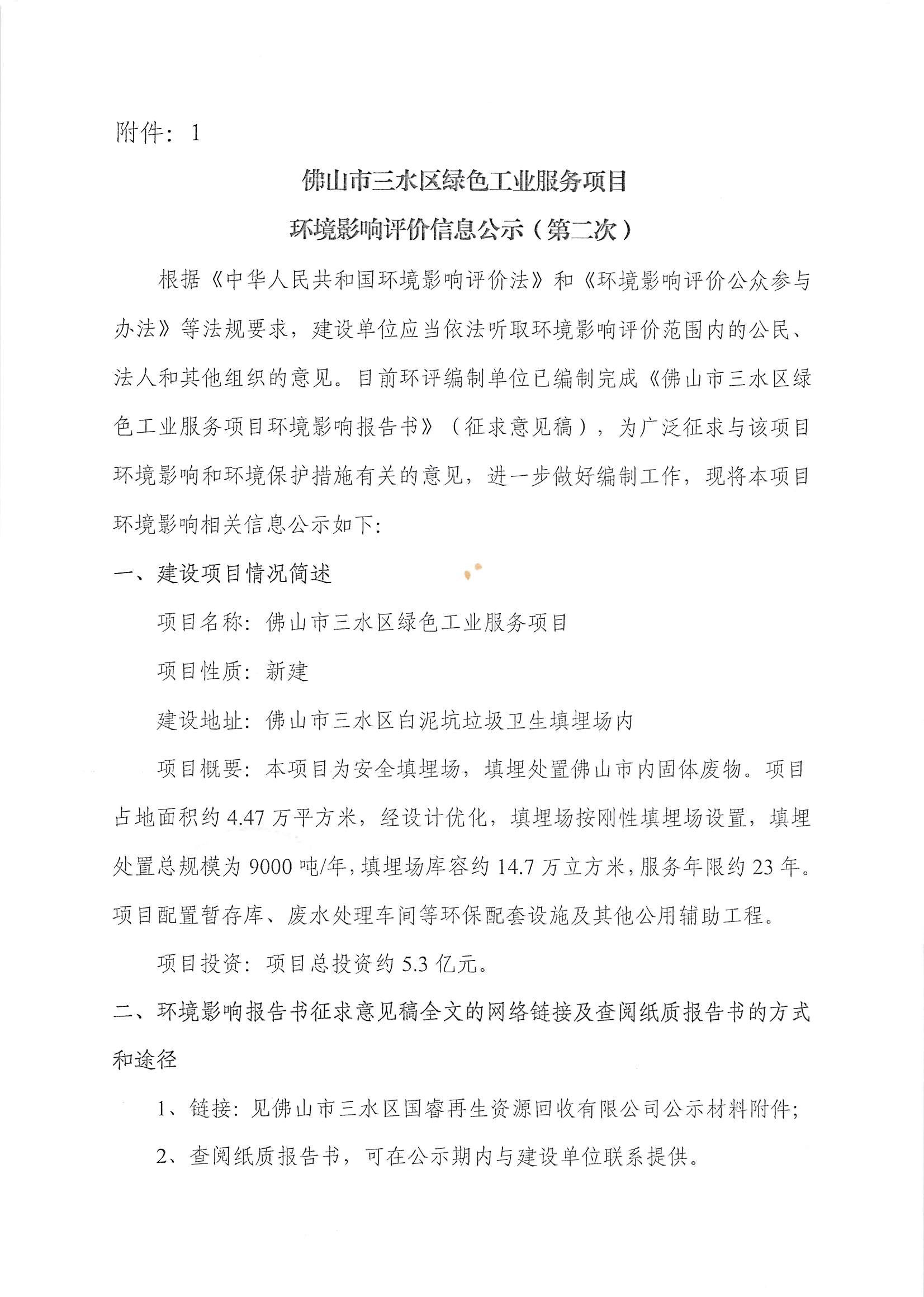 佛山市三水区绿色工业服务项目环境影响评价信息公示(第二次)