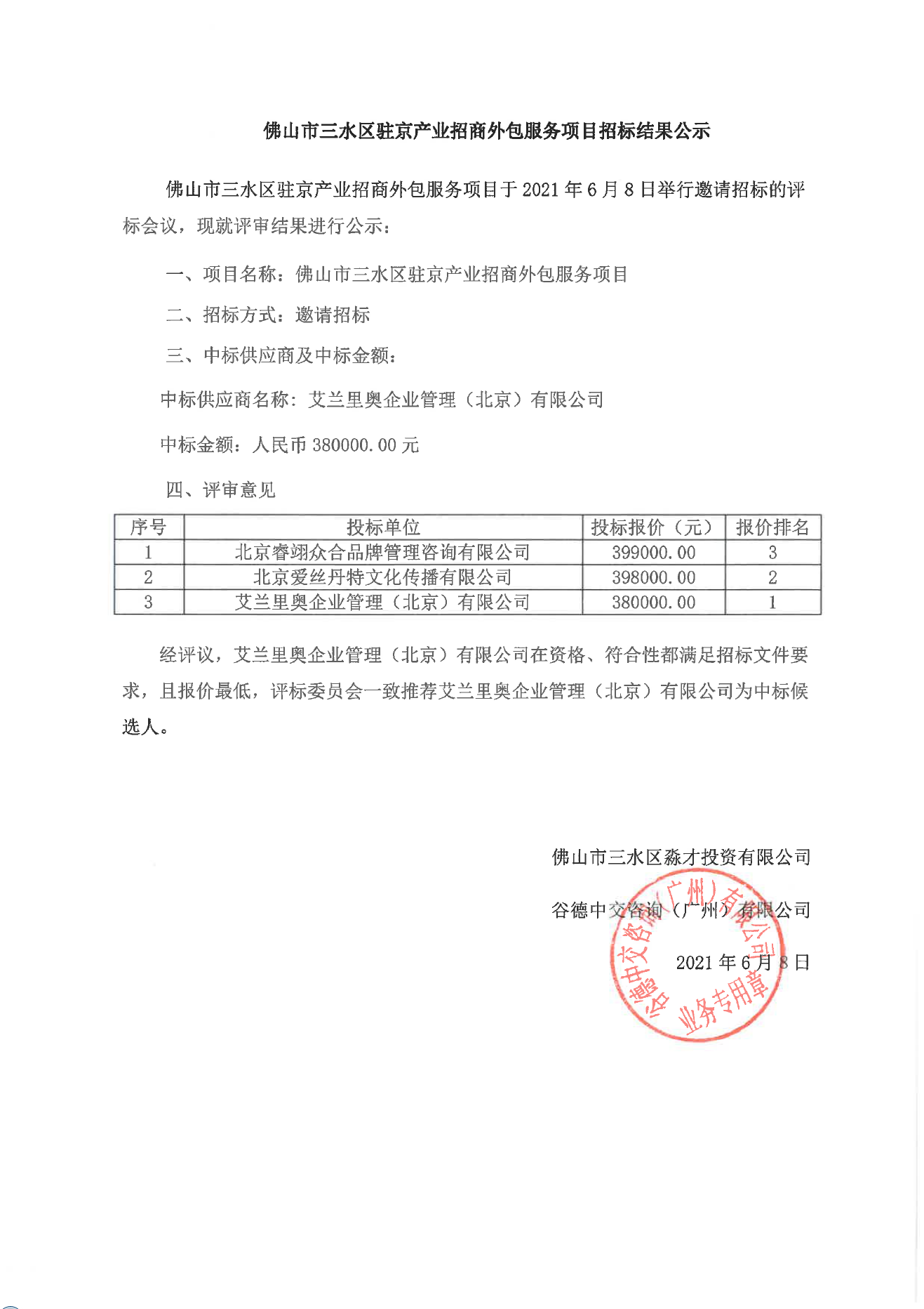 佛山市三水区驻京产业招商外包服务项目招标结果公示