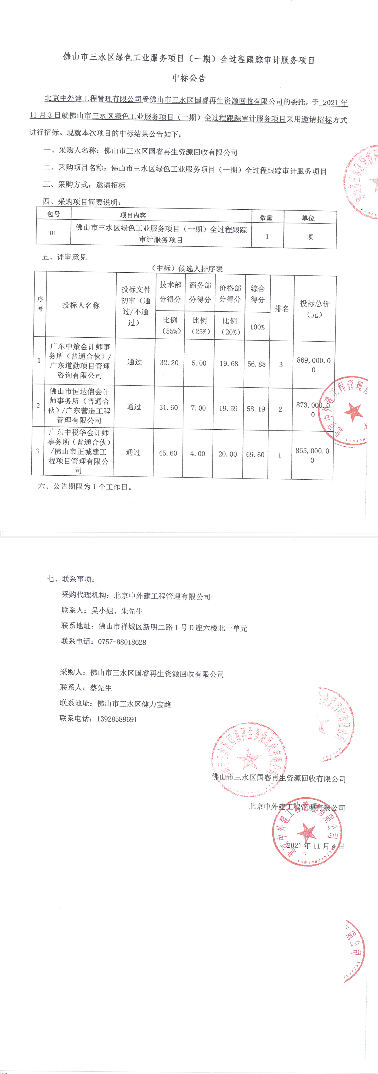 佛山市三水区绿色工业服务项目(一期)全过程跟踪审计服务项目中标公告
