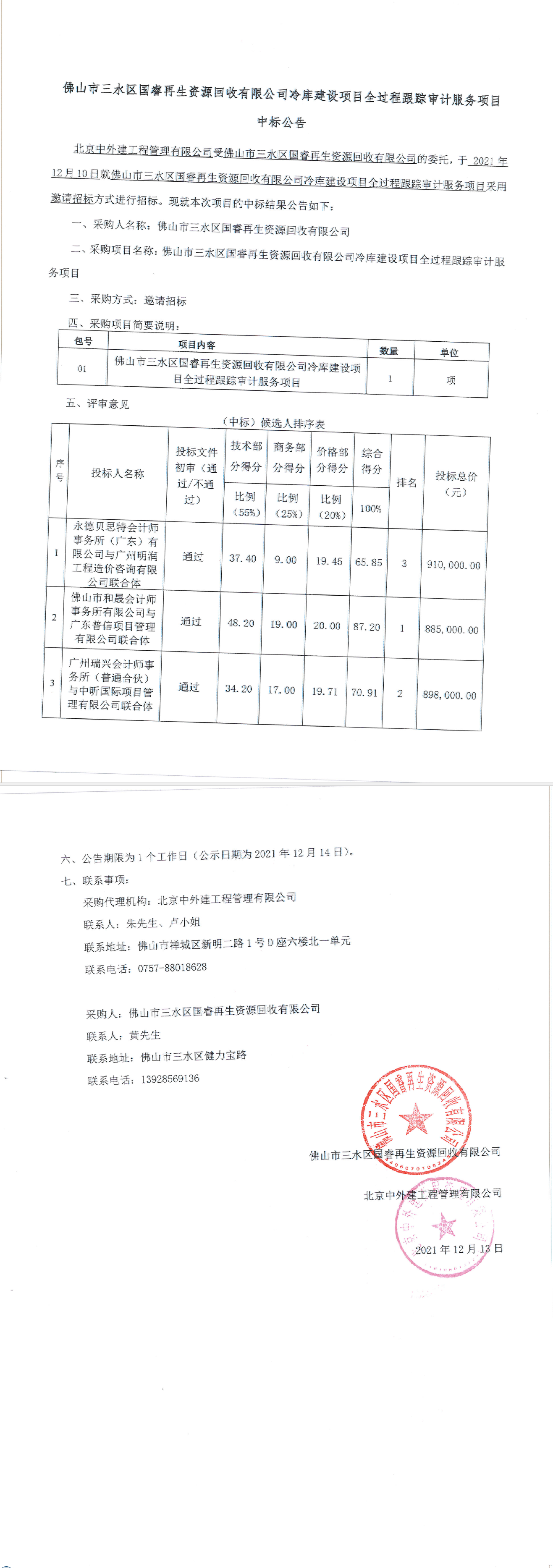 佛山市三水区国睿再生资源回收有限公司冷库建设项目全过程跟踪审计服务项目中标公告