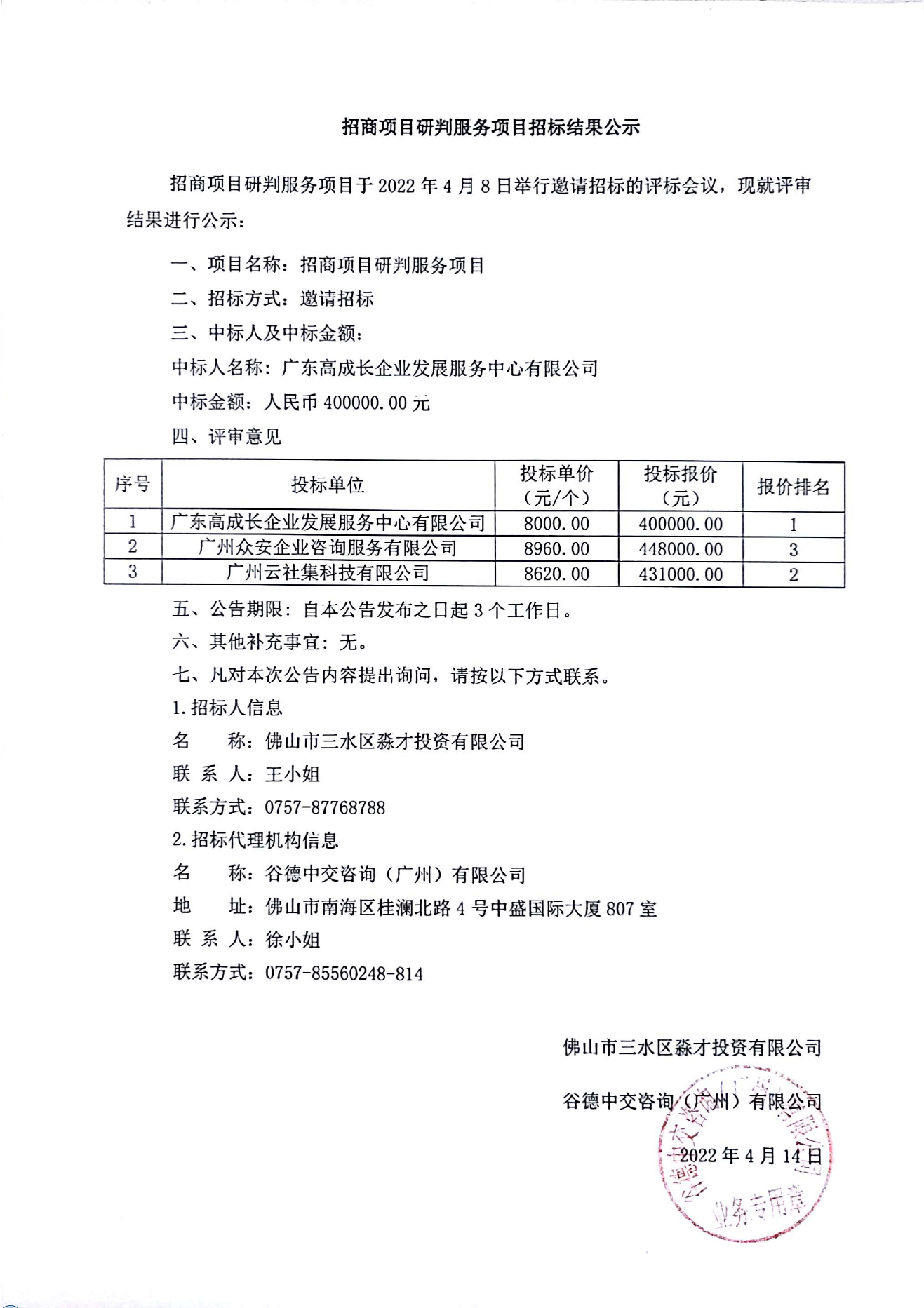 招商项目研判服务项目招标结果公示