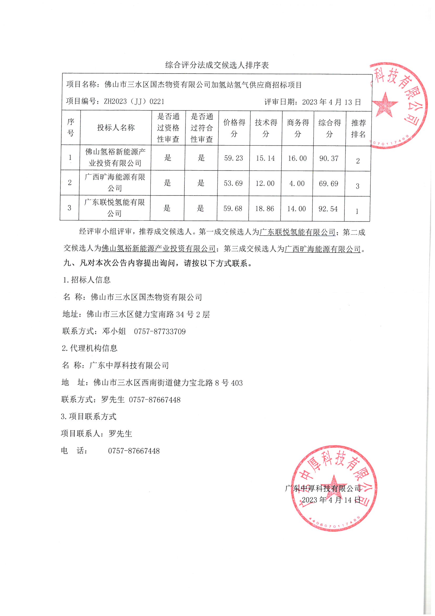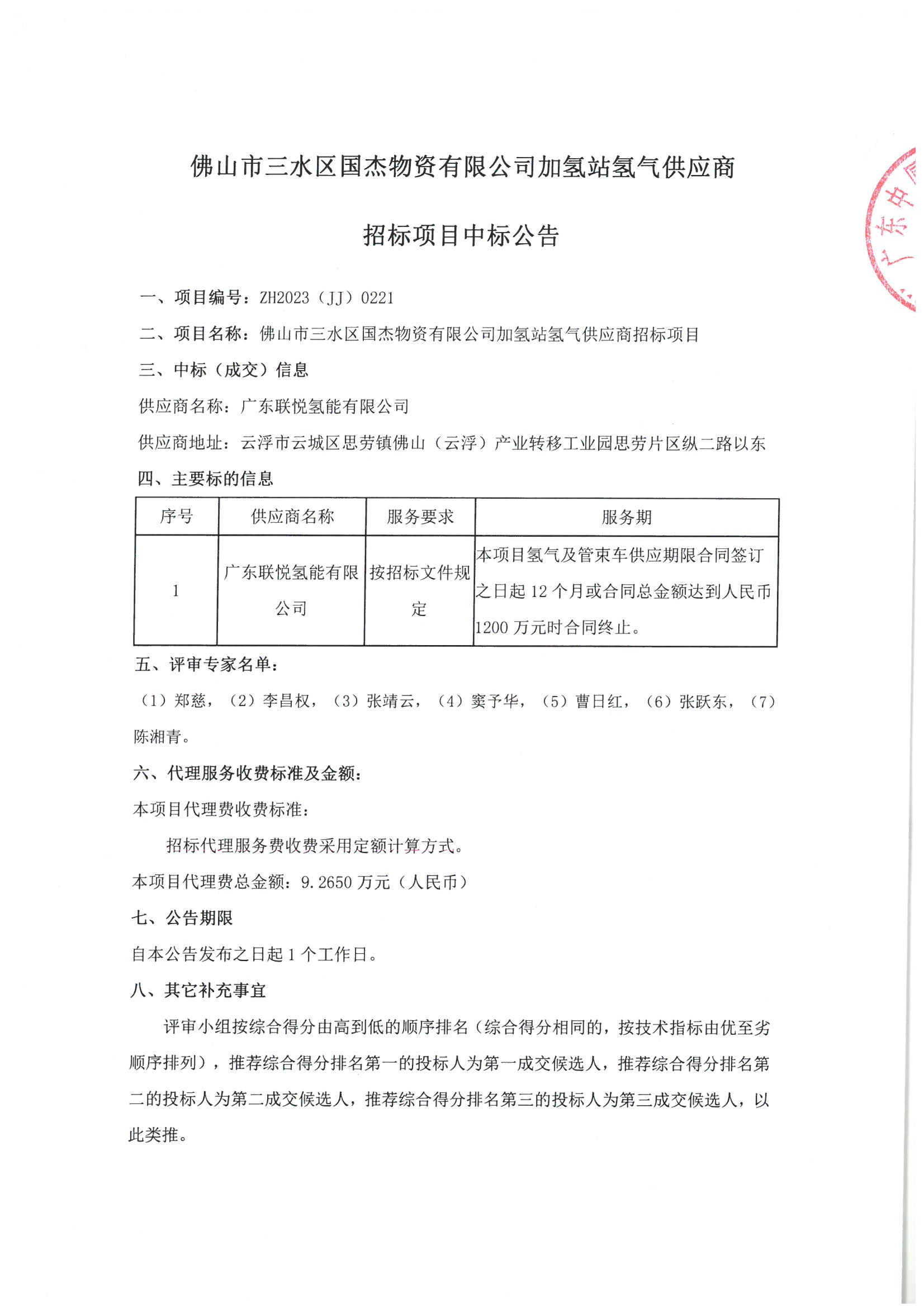 佛山市三水区国杰物资有限公司加氢站氢气供应商招标项目中标公告