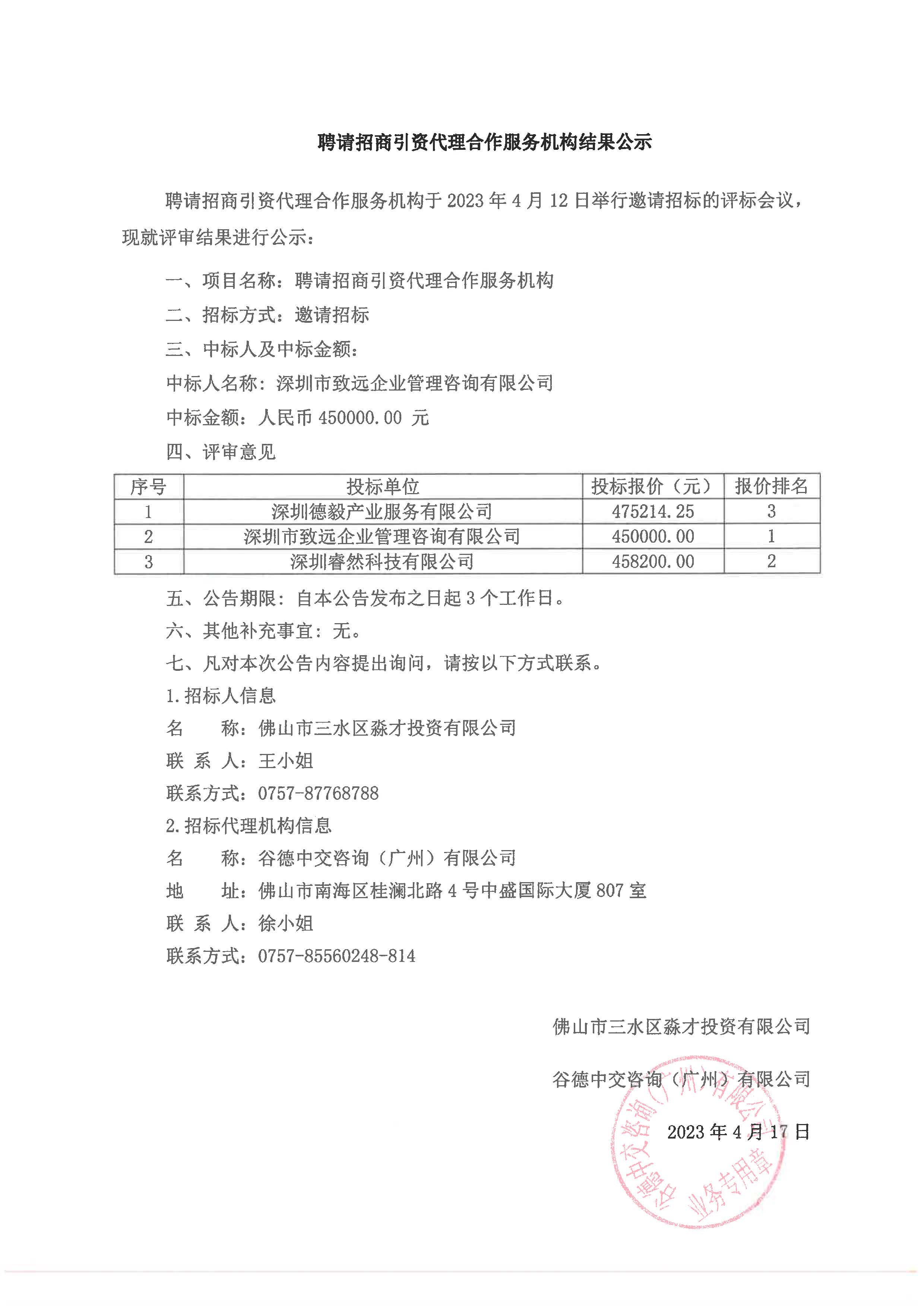 聘请招商引资代理合作服务机构结果公示