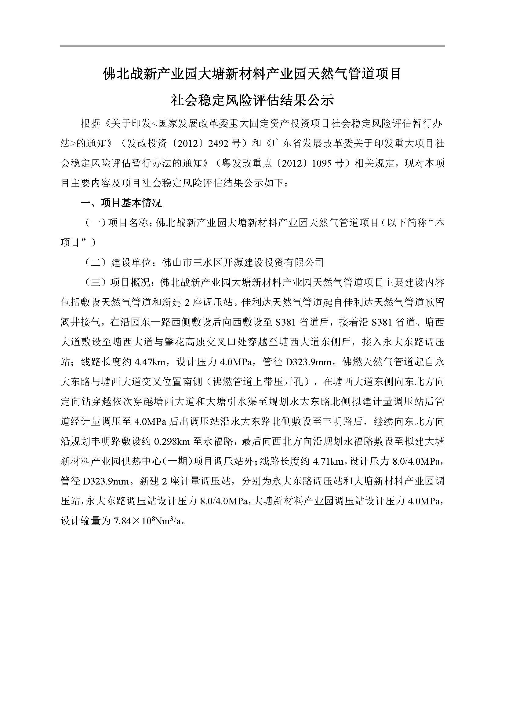 佛北战新产业园大塘新材料产业园天然气管道项目社会稳定风险评估结果公示