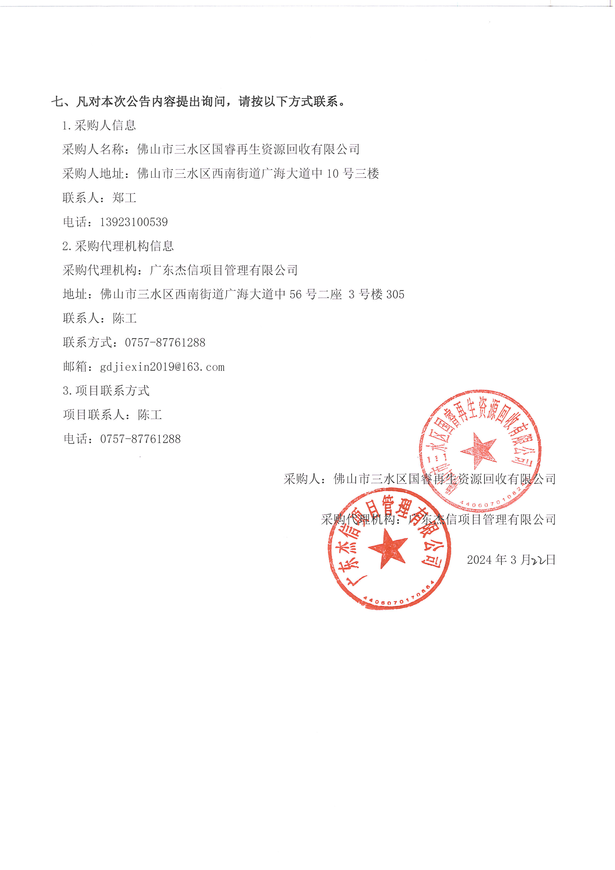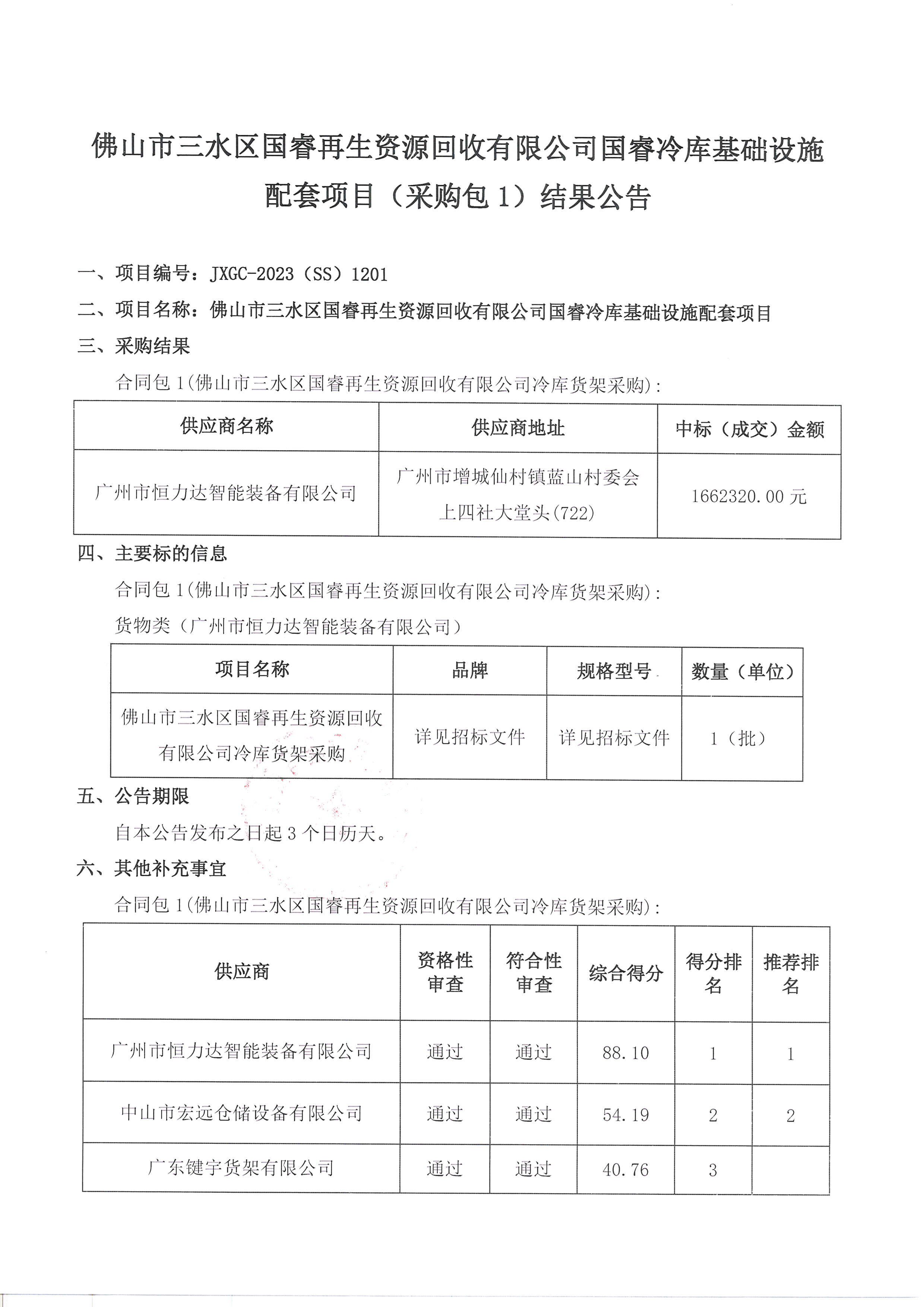佛山市三水区国睿再生资源回收有限公司国睿冷库基础设施配套项目(采购包1)结果公告