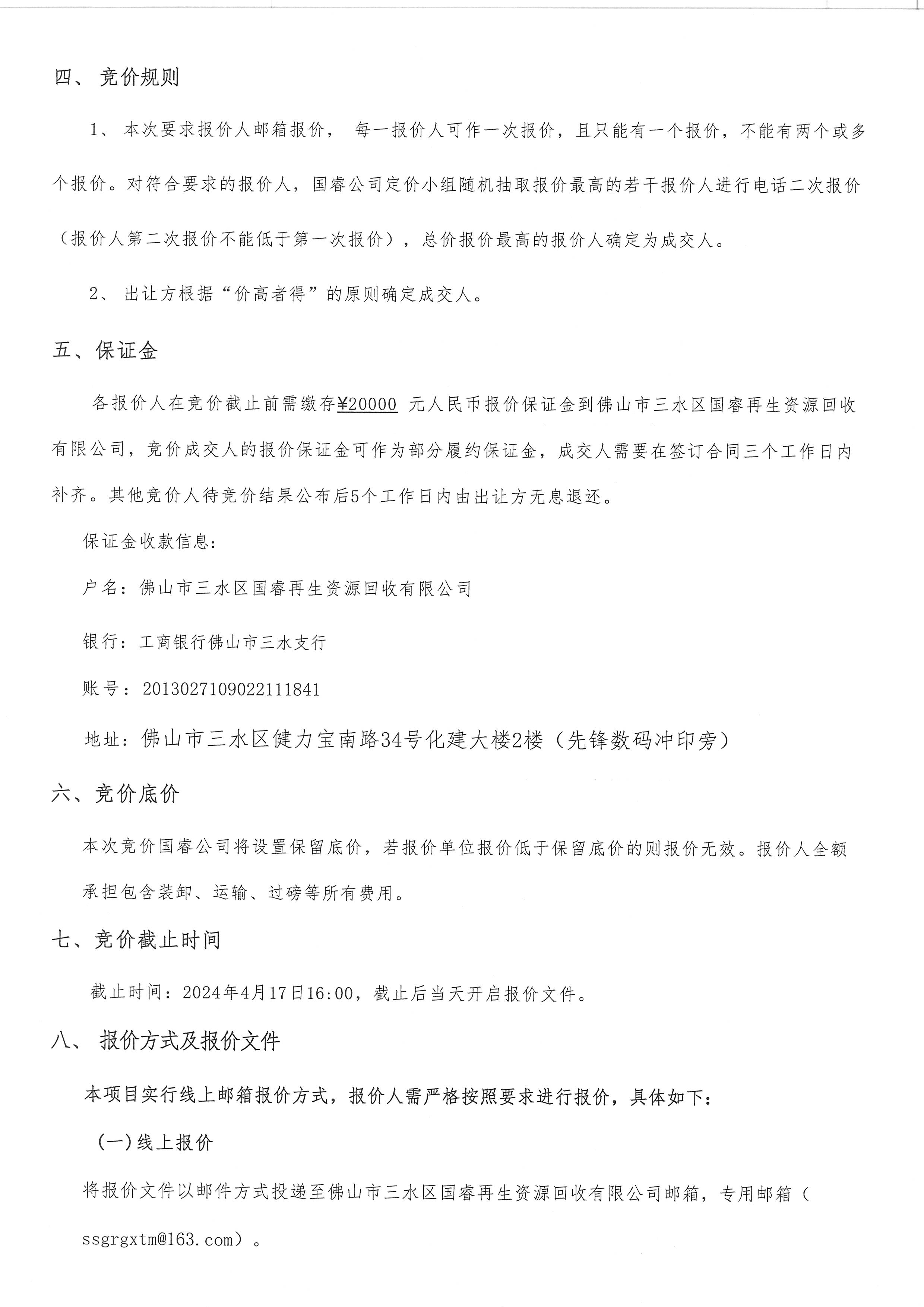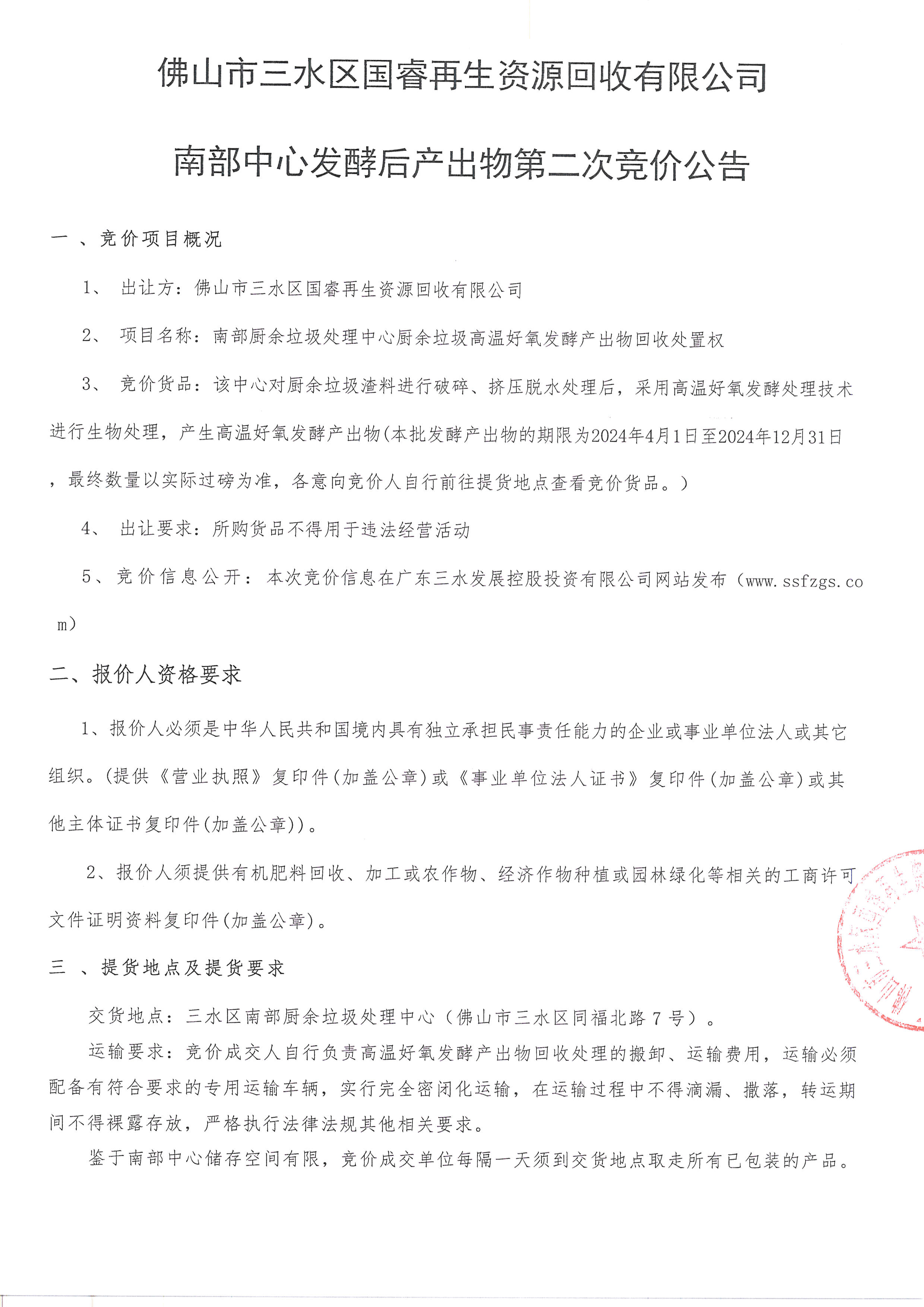 佛山市三水区国睿再生资源回收有限公司南部中心发酵后产出物第二次竞价公告