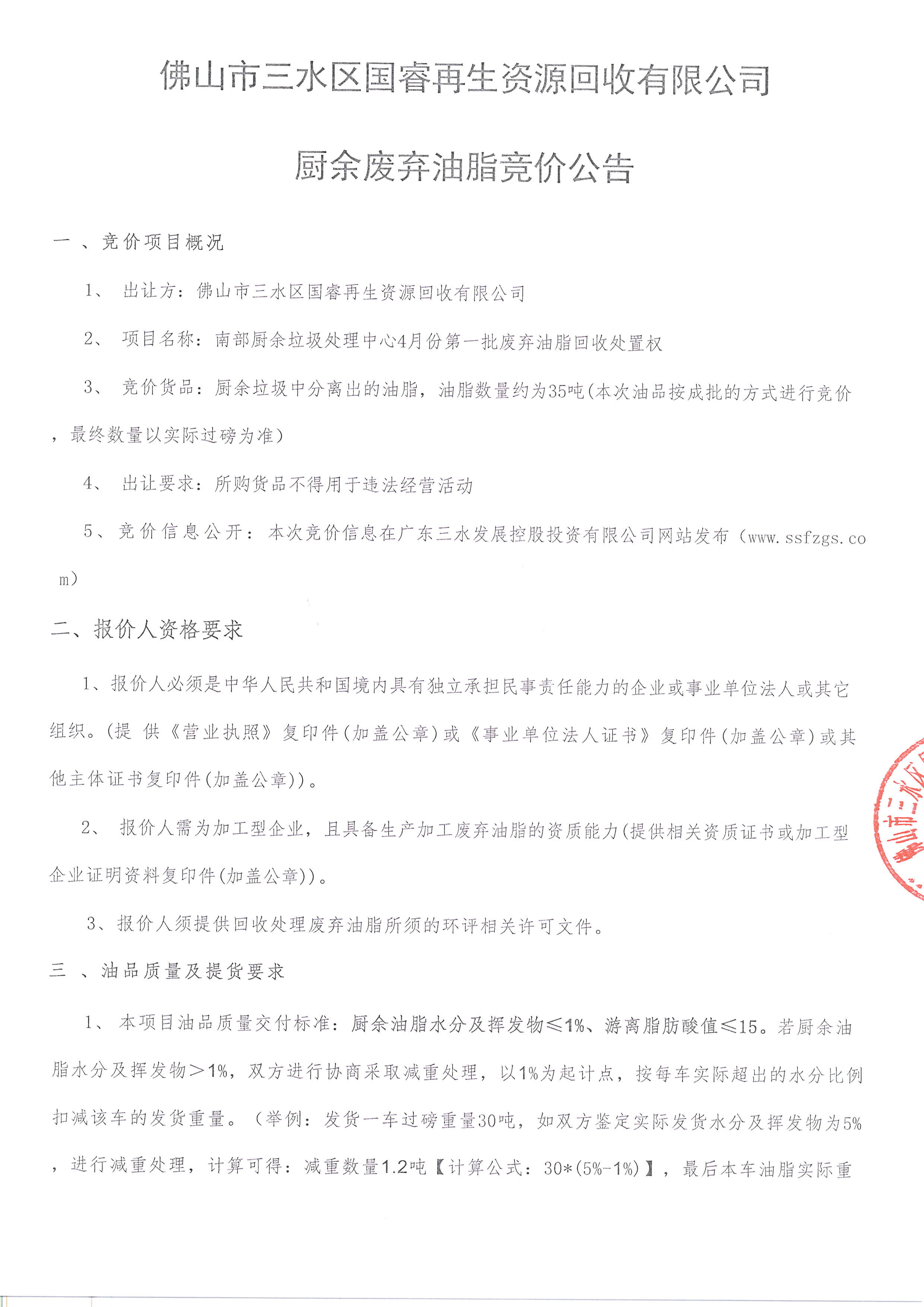 佛山市三水区国睿再生资源回收有限公司厨余废弃油脂竞价公告