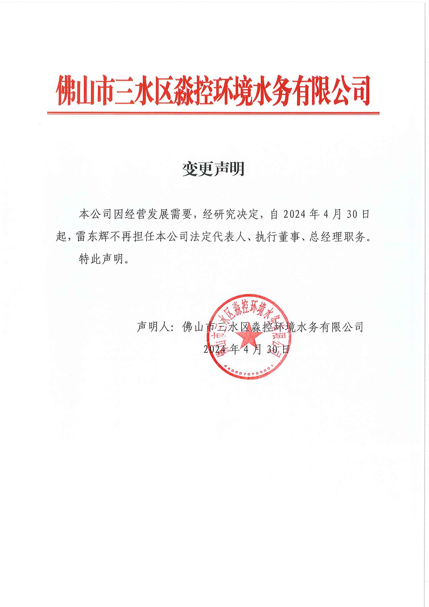 变更声明(通知不特定相对人)淼控水务