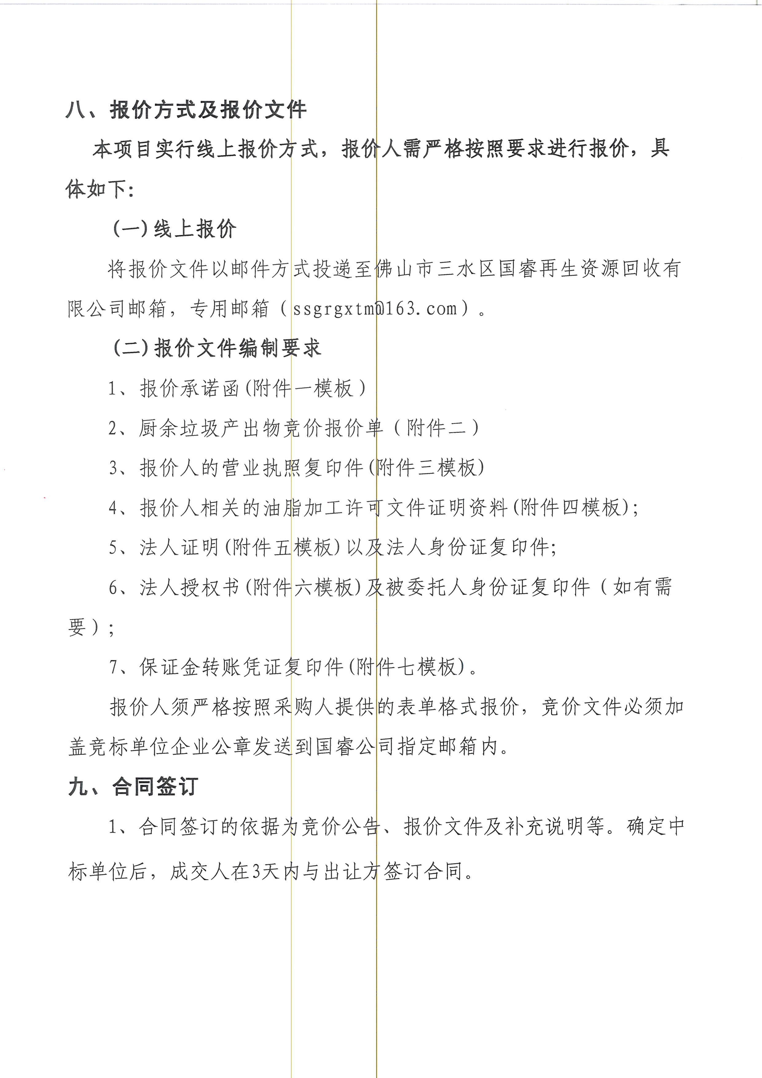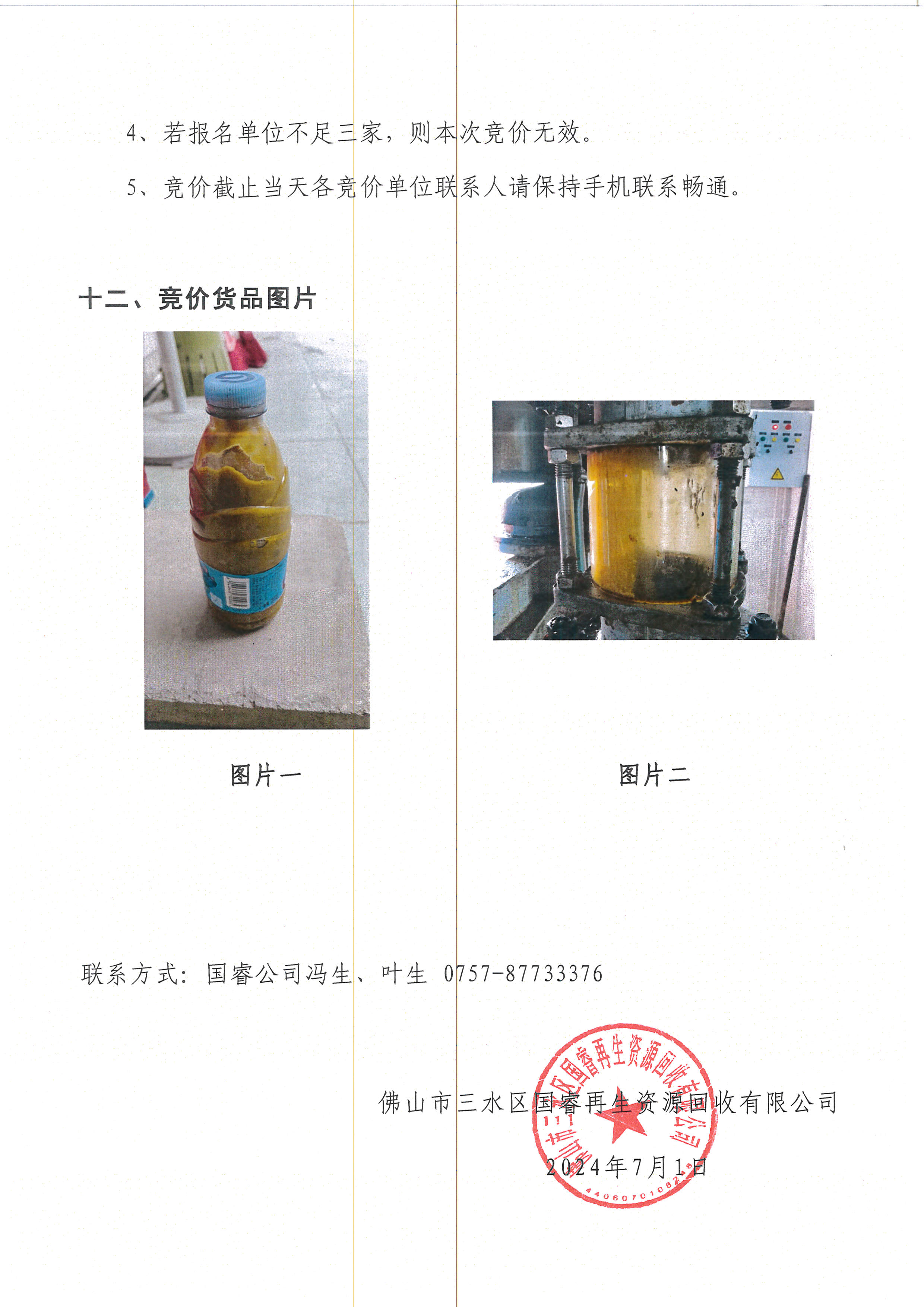 佛山市三水区国睿再生资源回收有限公司厨余废弃油脂竞价公告