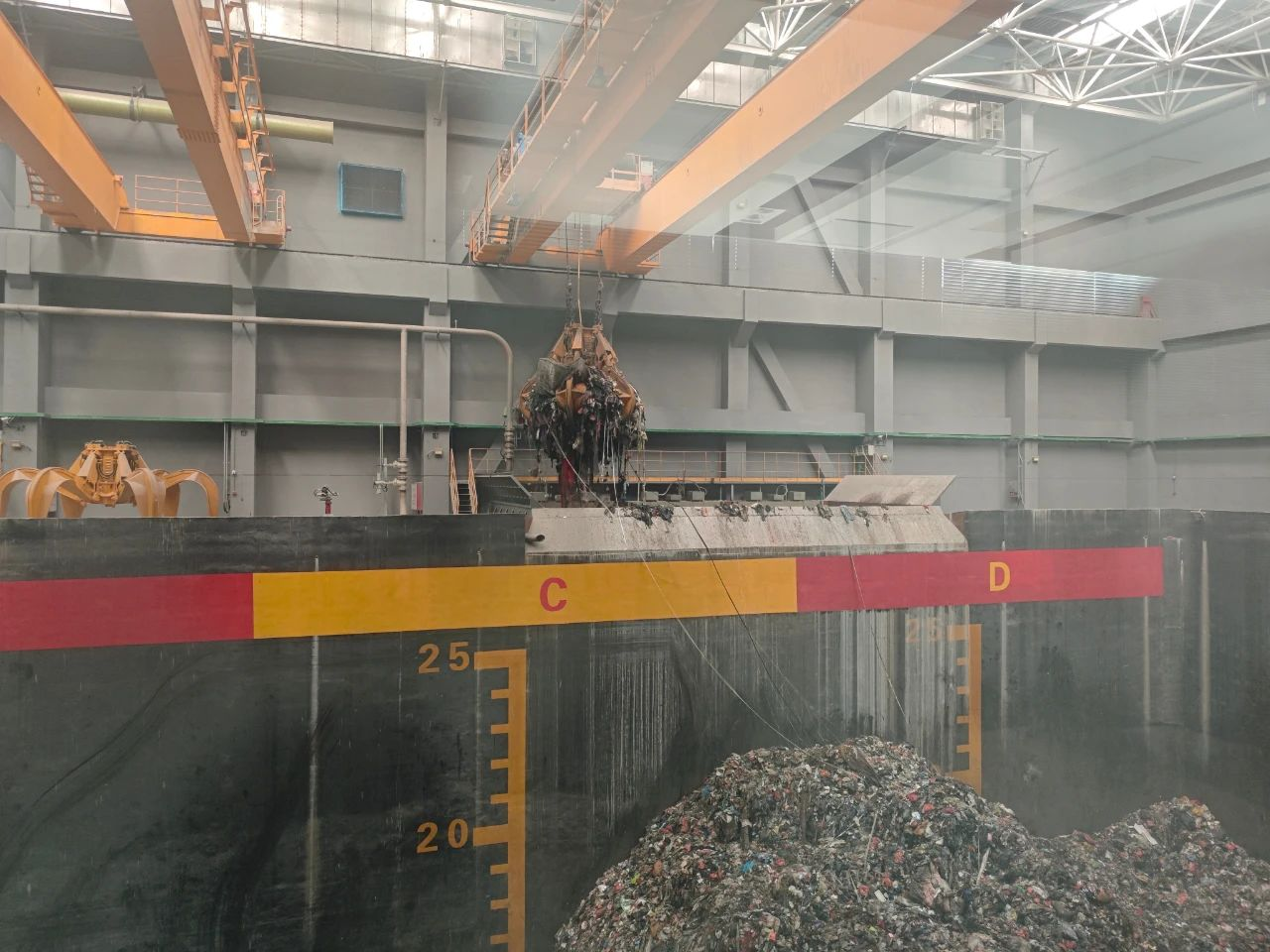经过预处理后的生活垃圾正被抓取投放到投料口进行焚烧处理