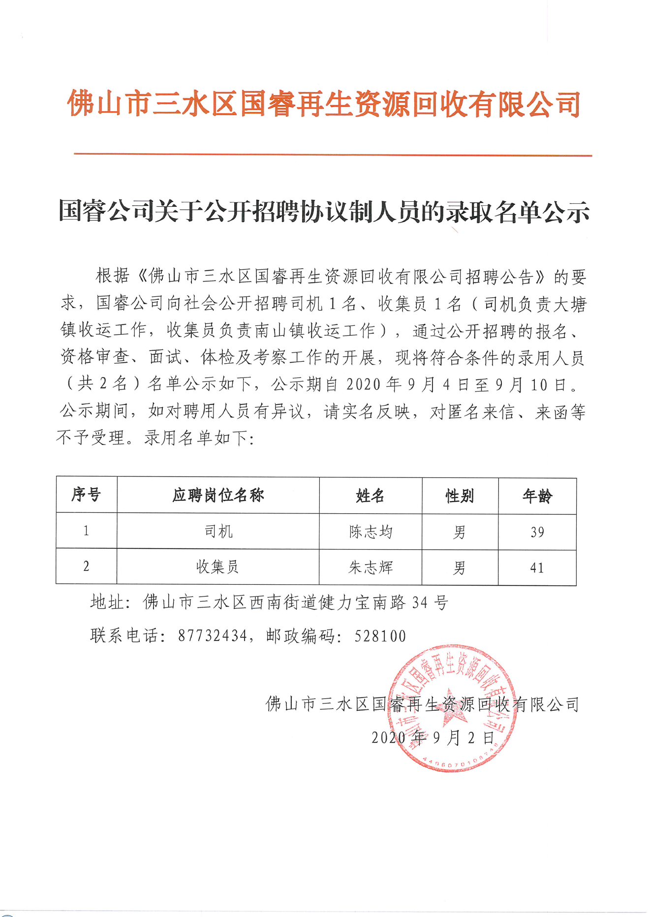国睿公司关于公开招聘协议制人员的录取名单公示
