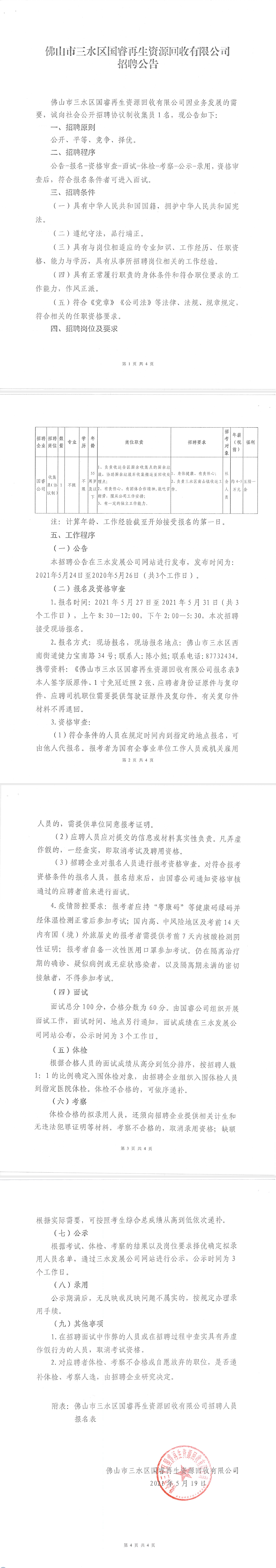 佛山市三水区国睿再生资源回收有限公司招聘公告